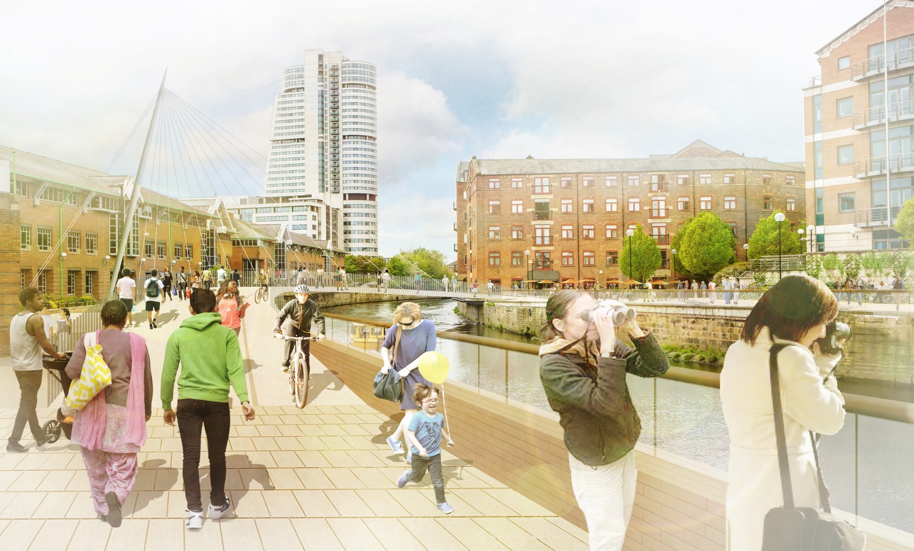 The funding will support installation of a new River Aire footbridge from Sovereign Square linking the park to Leeds Station. The footbridge is showcased in this artist impression.