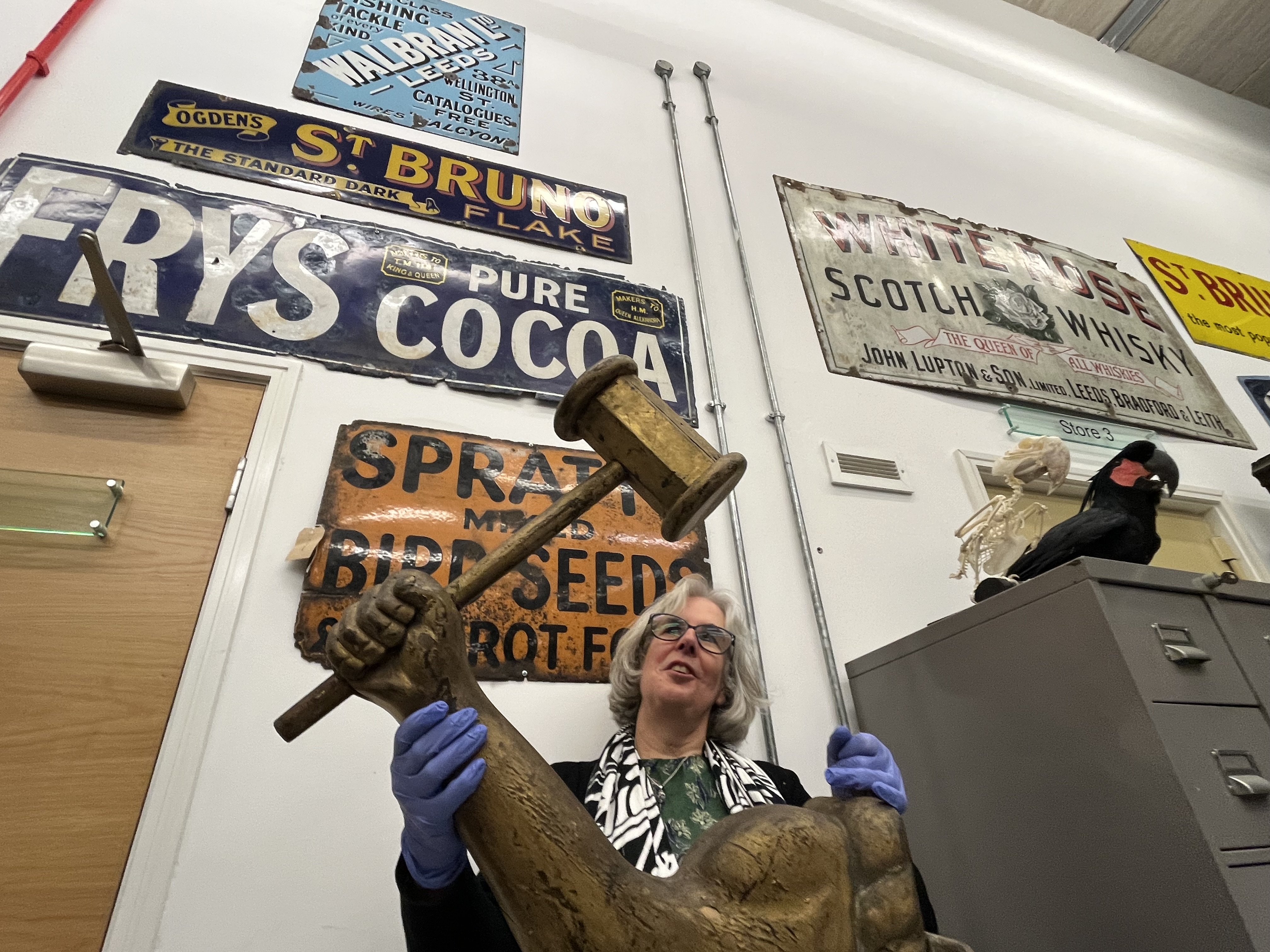 Part of the exhibition will be a selection of vintage signs which once adorned the streets of Leeds. These include a huge wooden arm and hammer which once advertised a Victorian gold beater’s shop, held here by KItty Ross, curator of social history with Leeds Museums and Galleries.