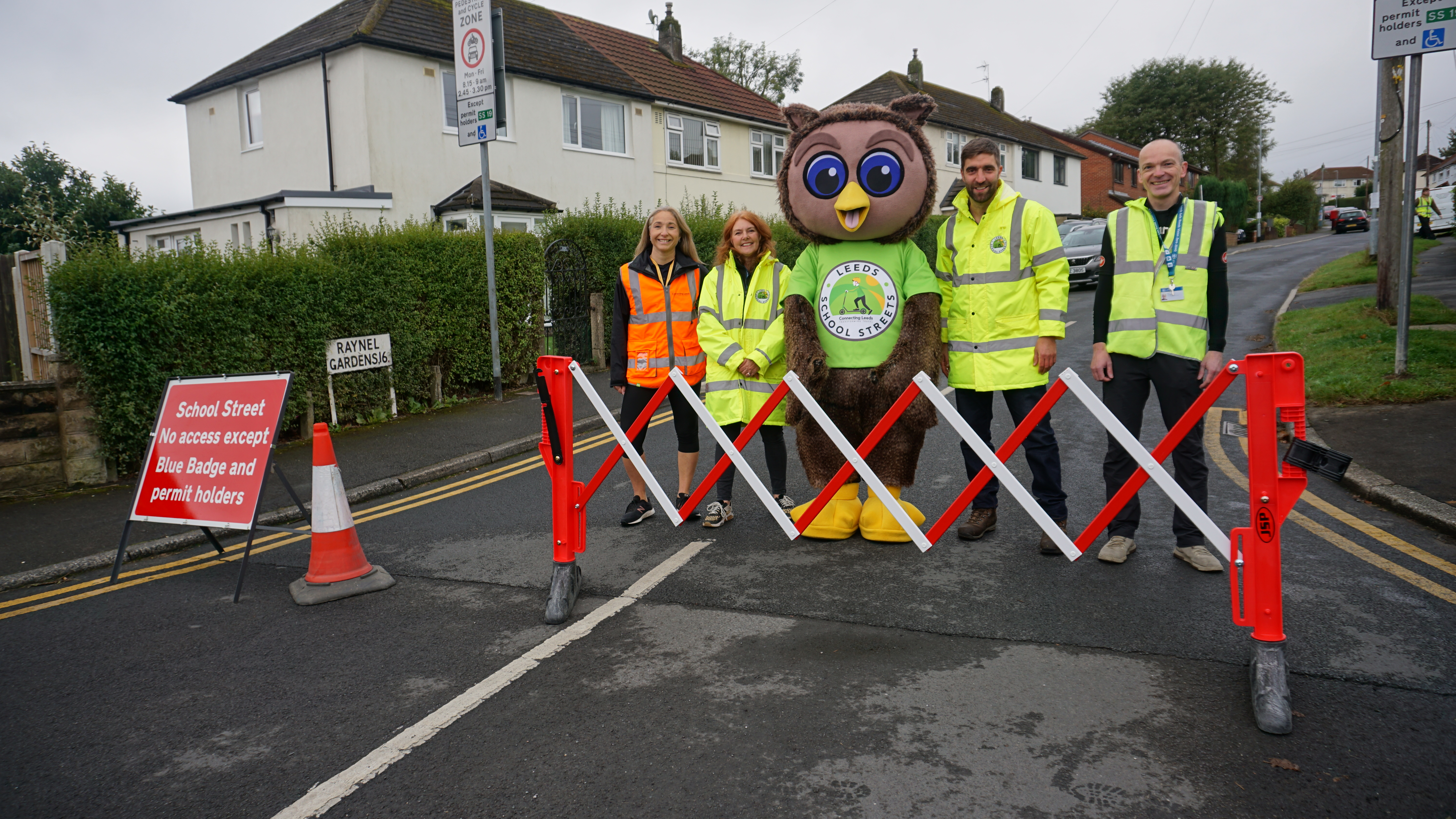 Leeds City Council's safe and sustainable travel team with Arlo the Owl, the council's safe and sustainable travel mascot on Ireland Wood's new School Street