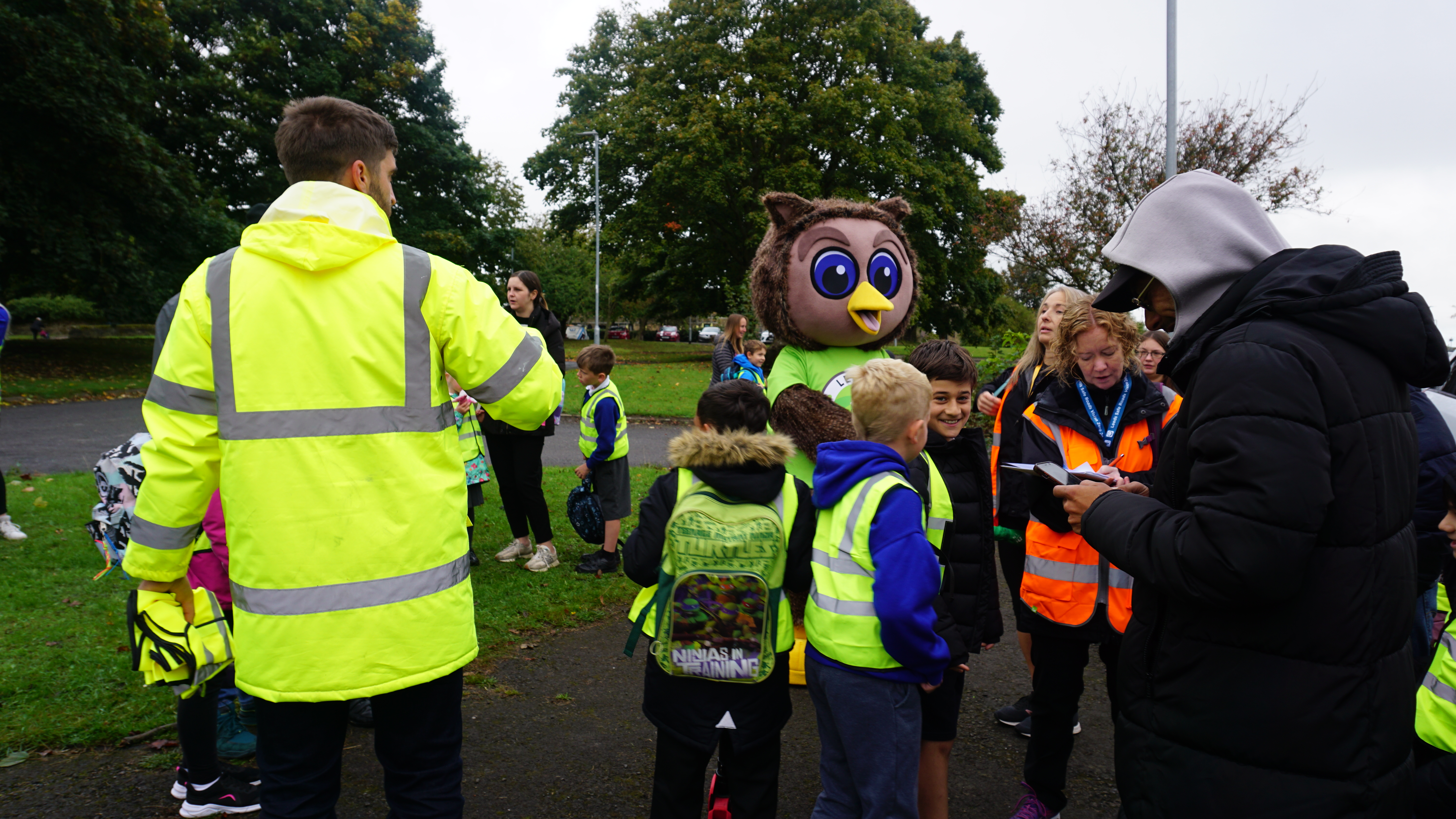 Arlo the Owl, the council's safe and sustainable travel mascot, meeting pupils from Ireland Wood Primary School before their walk to school
