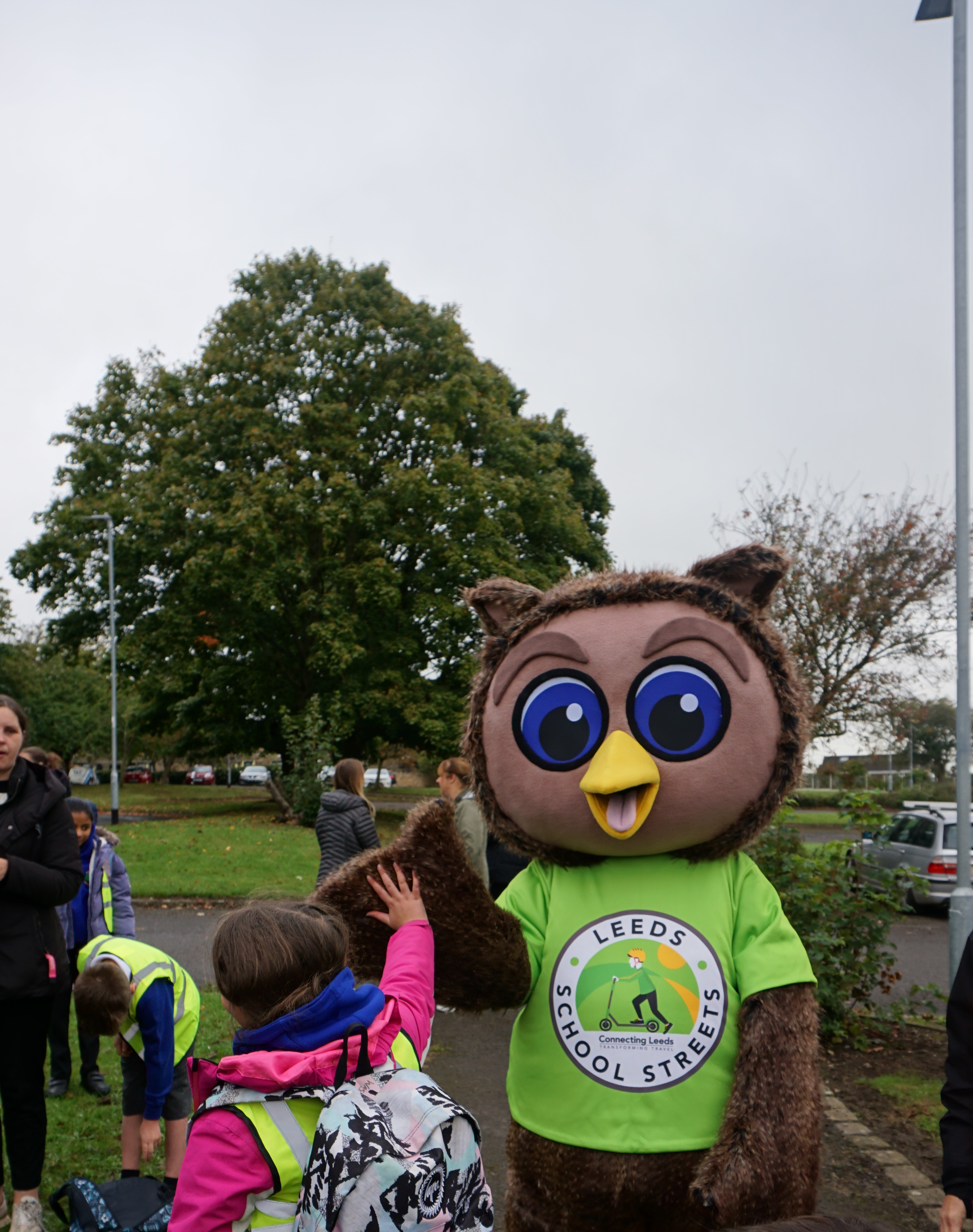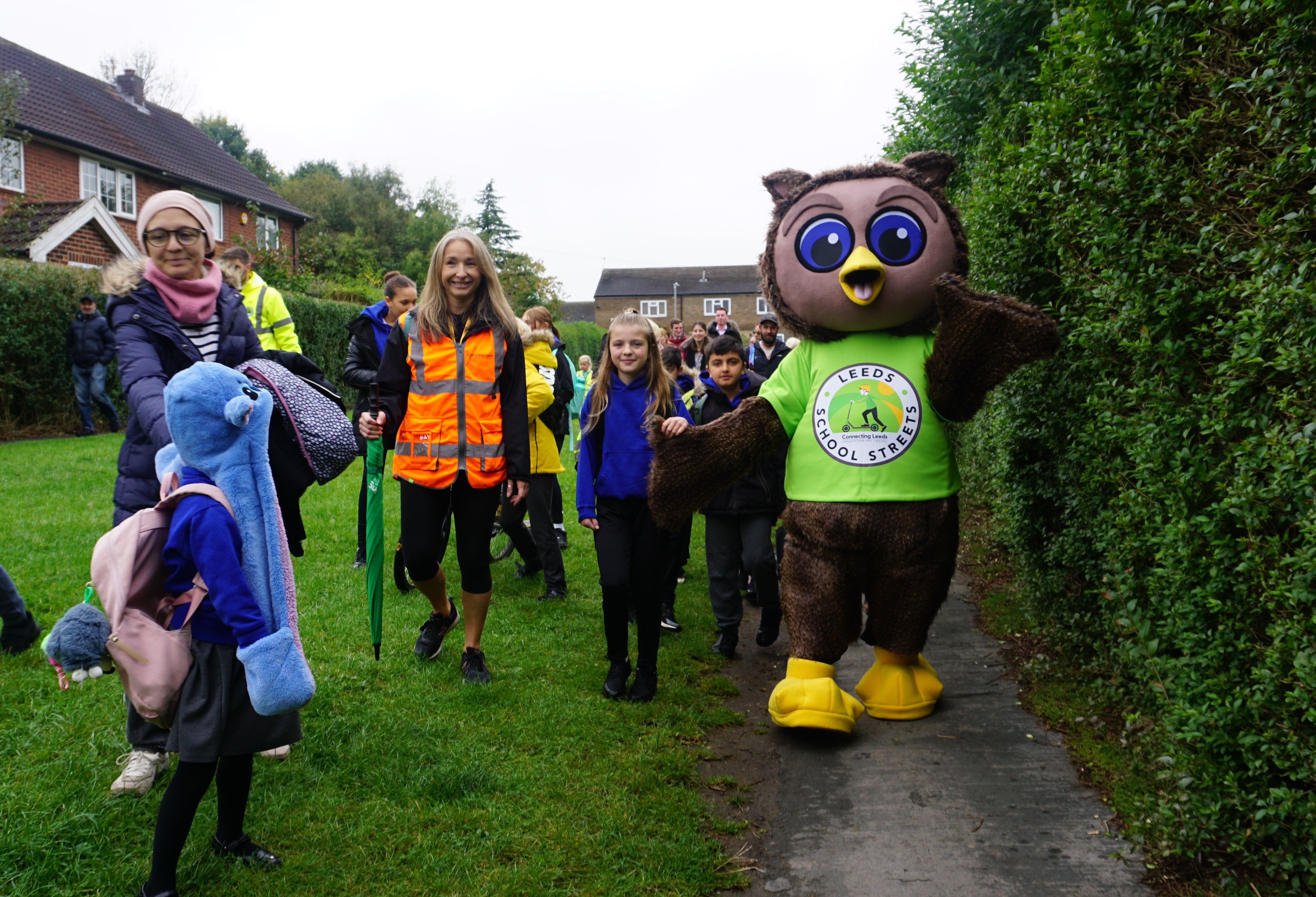 Safe and sustainable travel mascot, Arlo the Owl, guiding pupils from Ireland Wood primary school across the School Street