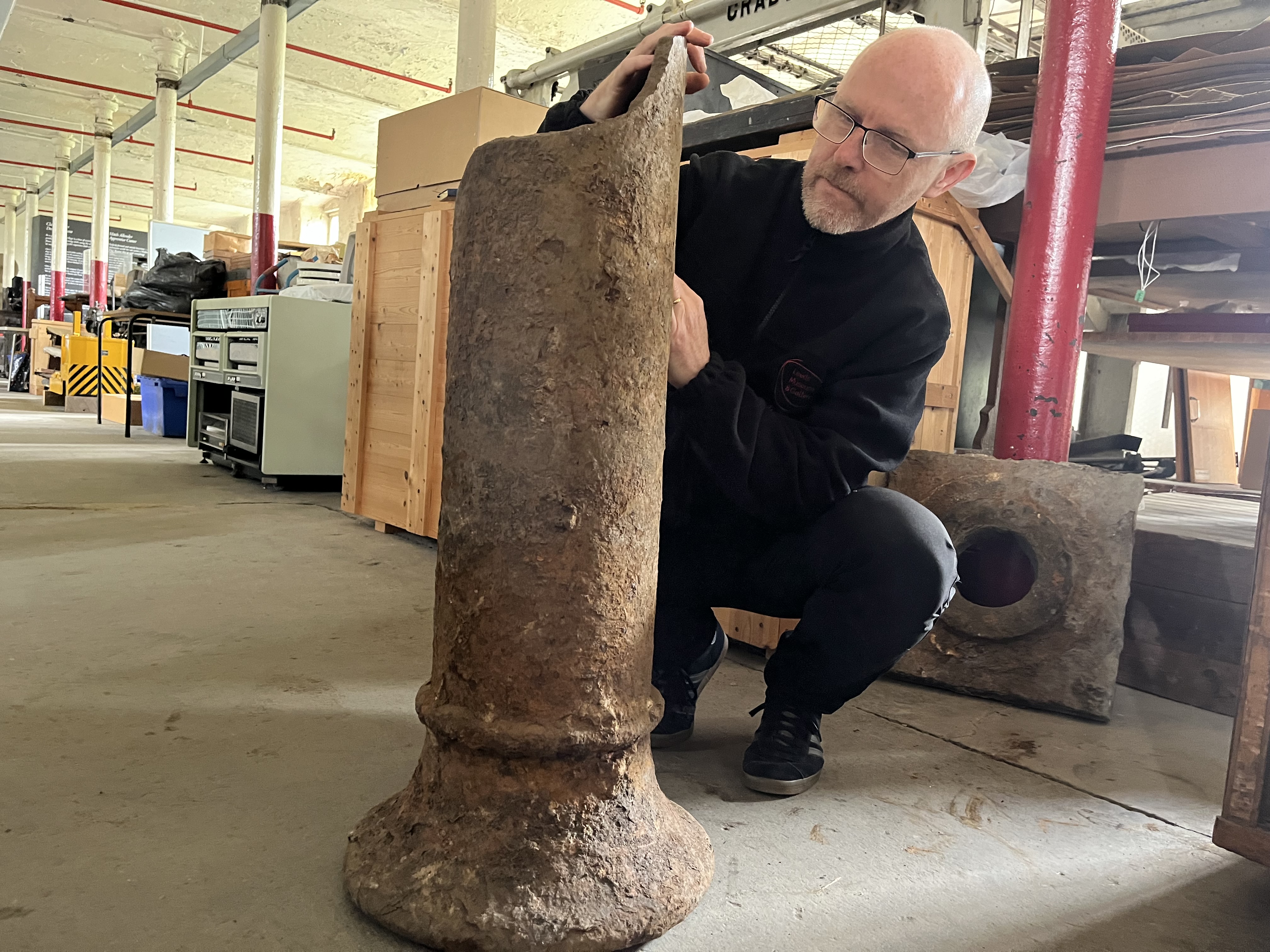 John McGoldrick, Leeds Museums and Galleries’ curator of industrial history with the remnants of one of the station’s huge cast iron pillars, which would once have held up the roof while passengers made their way around its platforms. The impressive iron columns also doubled as rainwater down pipes.