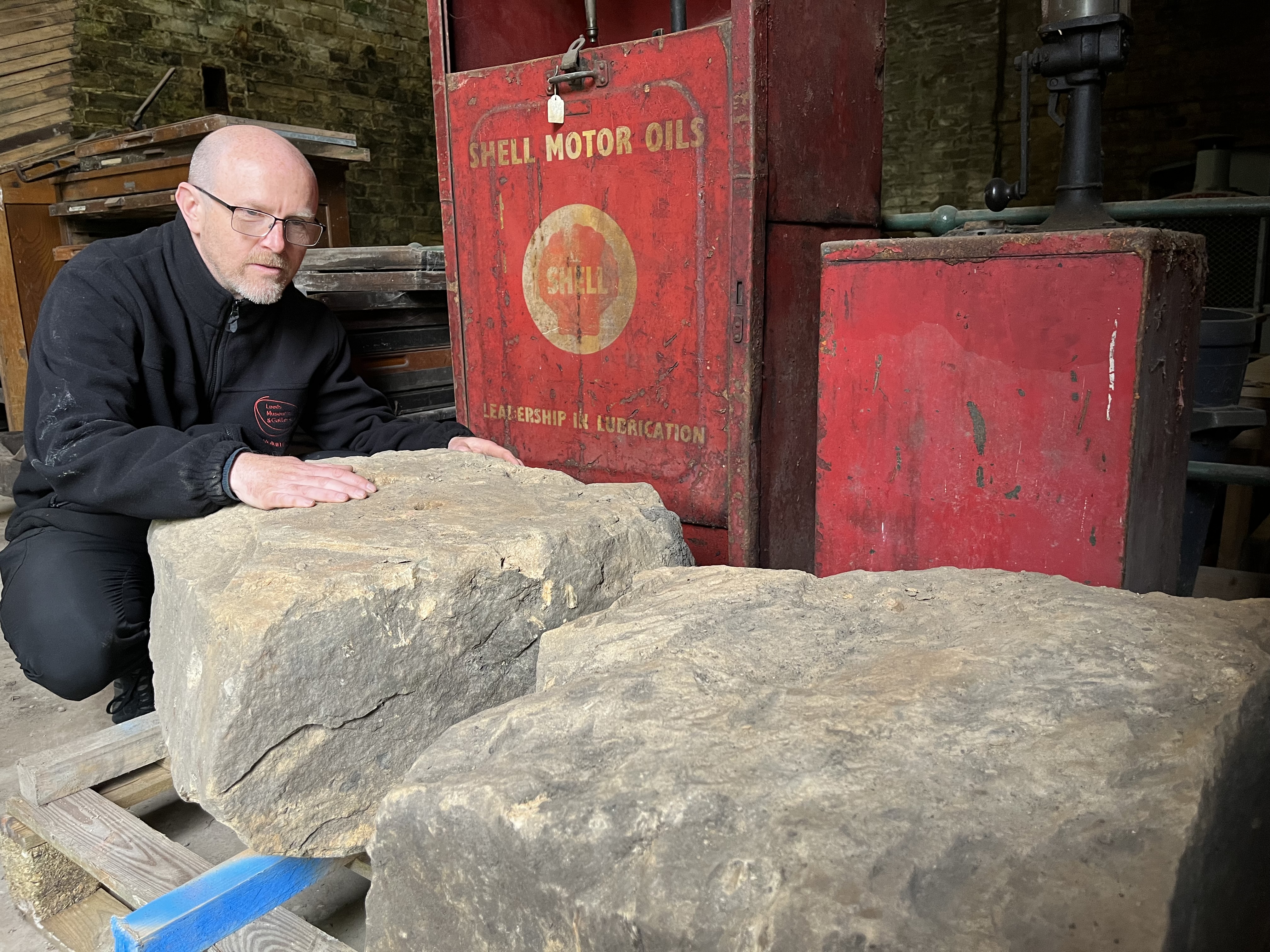 John McGoldrick, Leeds Museums and Galleries’ curator of industrial history with a pair of huge stone sleepers, used to secure tracks at the Marsh Lane railway station in the years before wooden sleepers were employed. The sleepers still show the holes where railway spikes were driven into them.