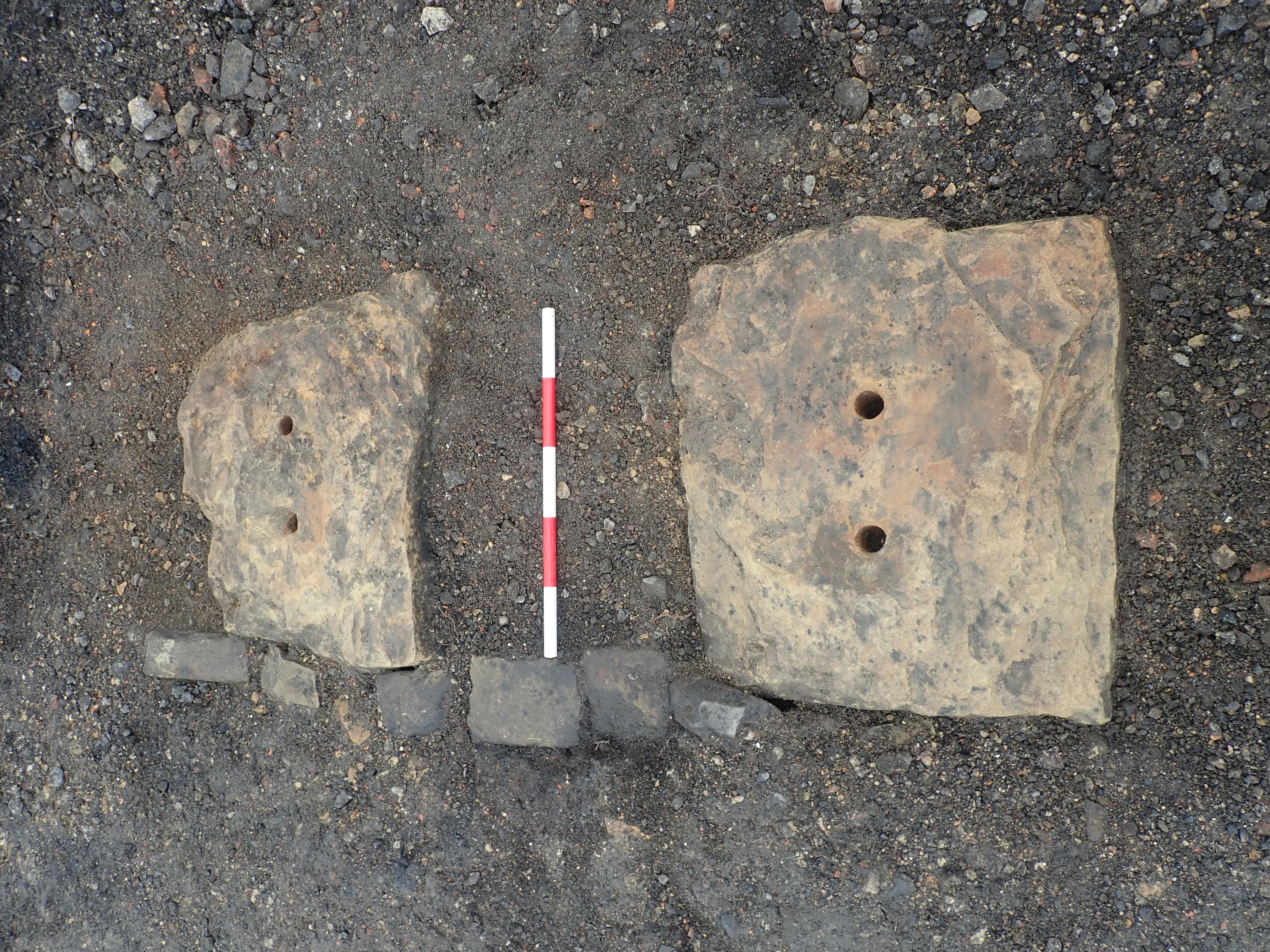 Huge stone sleepers, used to secure tracks in the years before wooden sleepers were employed and which still show the holes where railway spikes were driven into them.
