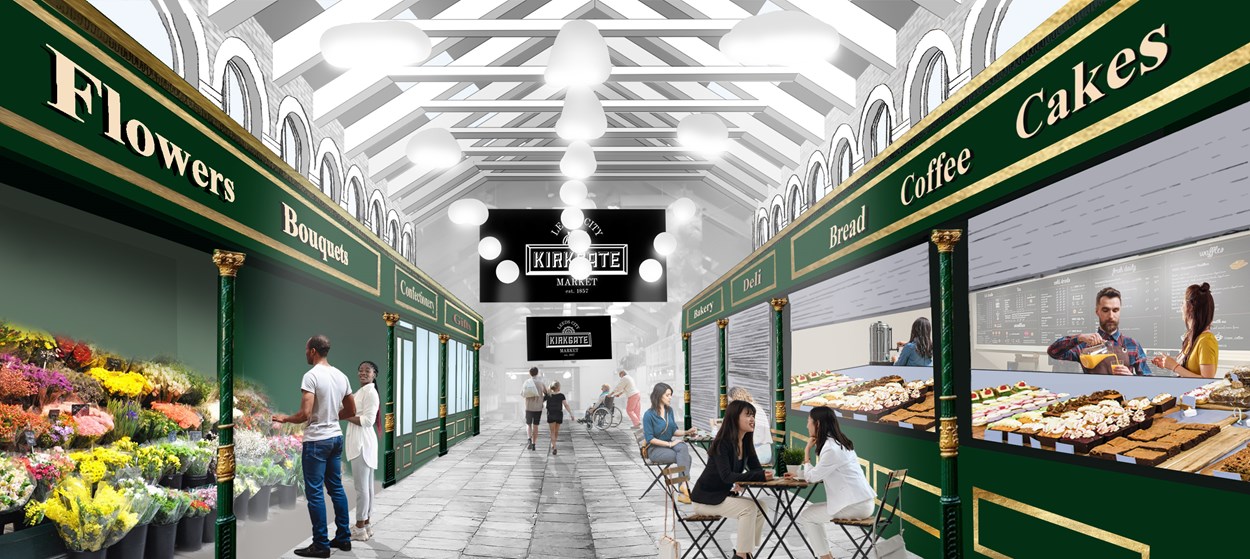 A computer-generated image showing Leeds City Council's vision for the market's blockshops area.