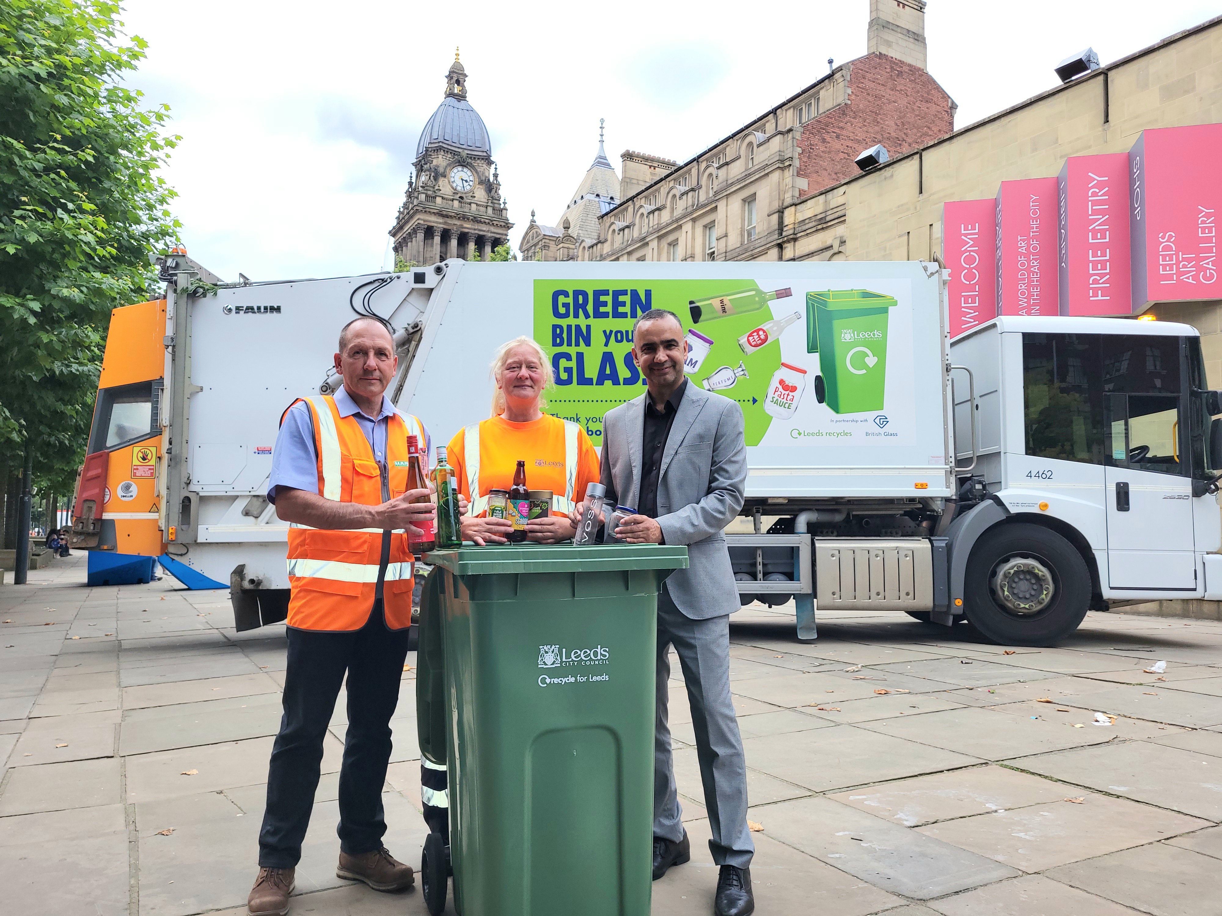 L-R Declan Nortcliffe, Operations Director at HW Martin Waste Ltd, Mel Dinsdale, crew chargehand and Councillor Mohammed Rafique, Leeds City Council’s executive member for climate, energy, environment and green space at the launch of glass recycling in Leeds.