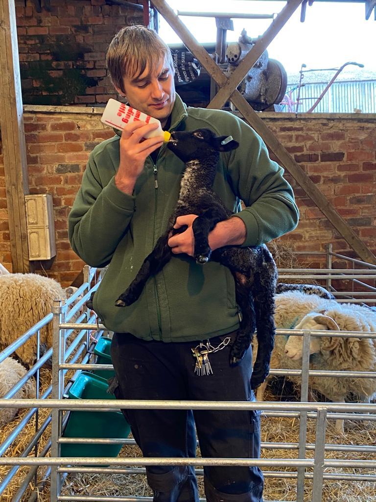 Farmer Joe Green with one of the newborn lambs at Home Farm. Joe is keeping a weekly video blog on the estate's Facebook page.
