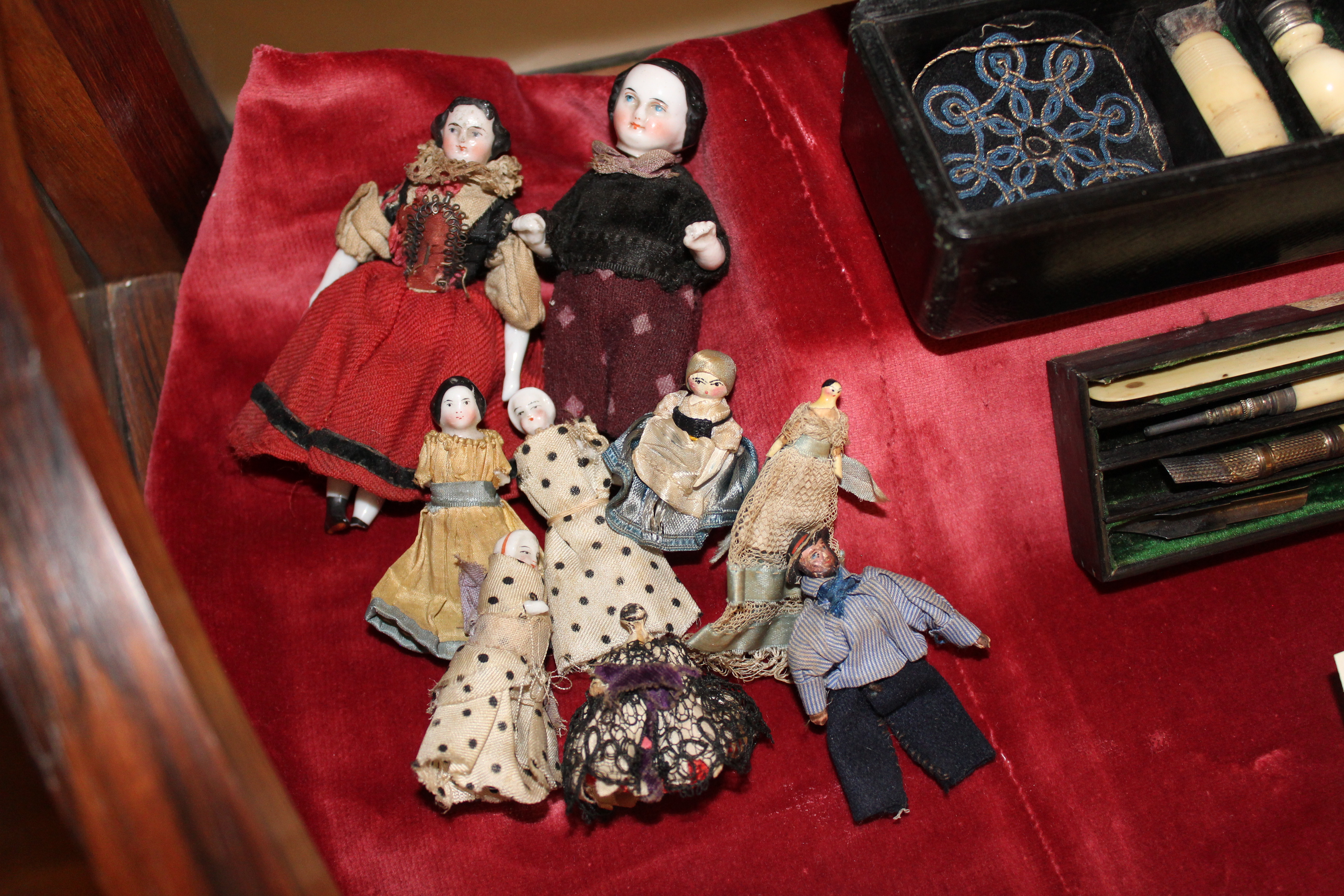 When Florence and Marianne were children they often played with dolls. This assortment of little porcelain dolls belonged to Marianne Nicholson. She used to carry them around in a homemade purse in her pocket. The cousins could play with them anywhere.