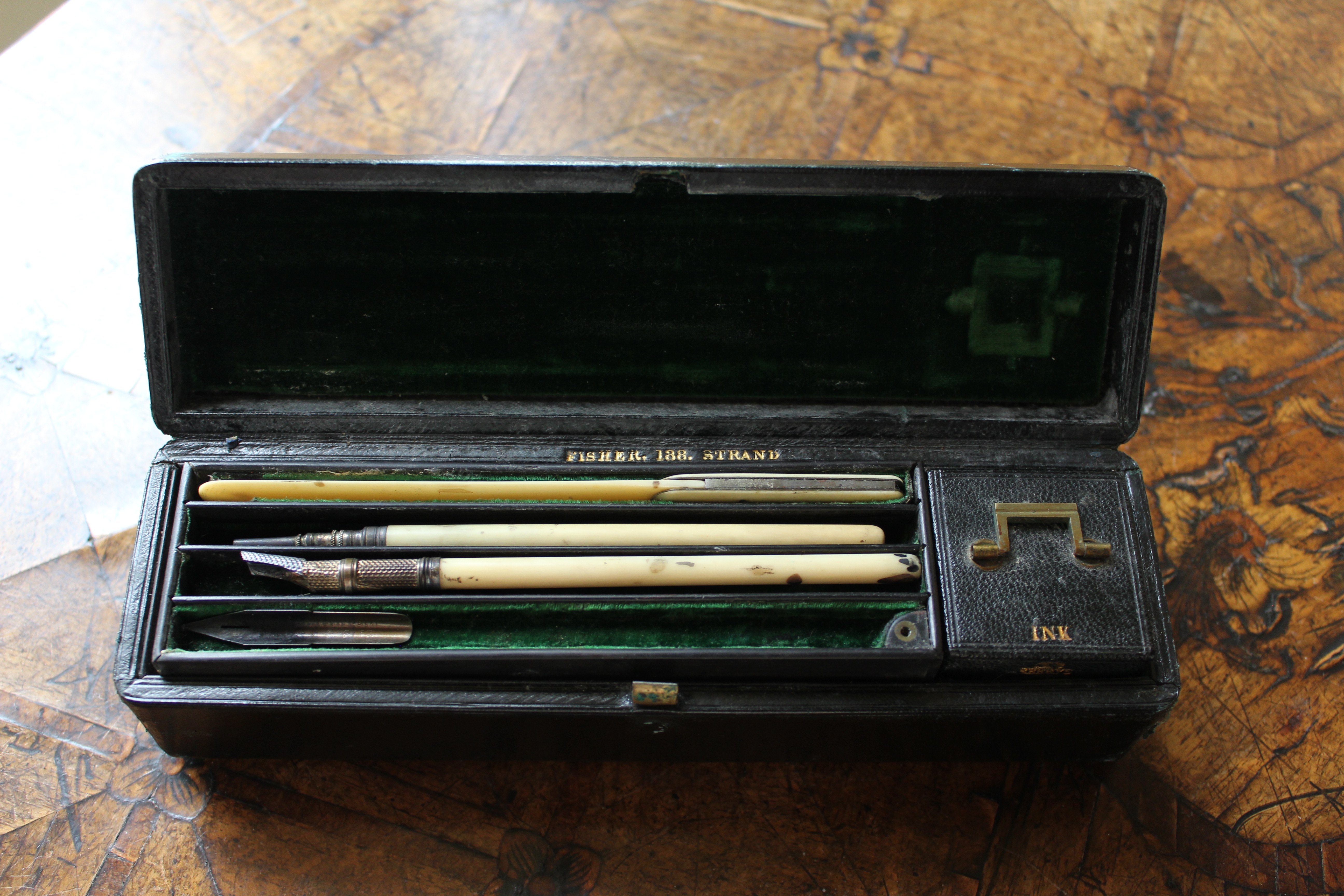 This pen set belonged to Marianne Nicholson. She would have used it to write all her letters to Florence Nightingale when she was young. It contains a pen with nibs, ink, a pen wipe, a seal engraved with MN and a stick for rubbing paper ready for a wax seal.