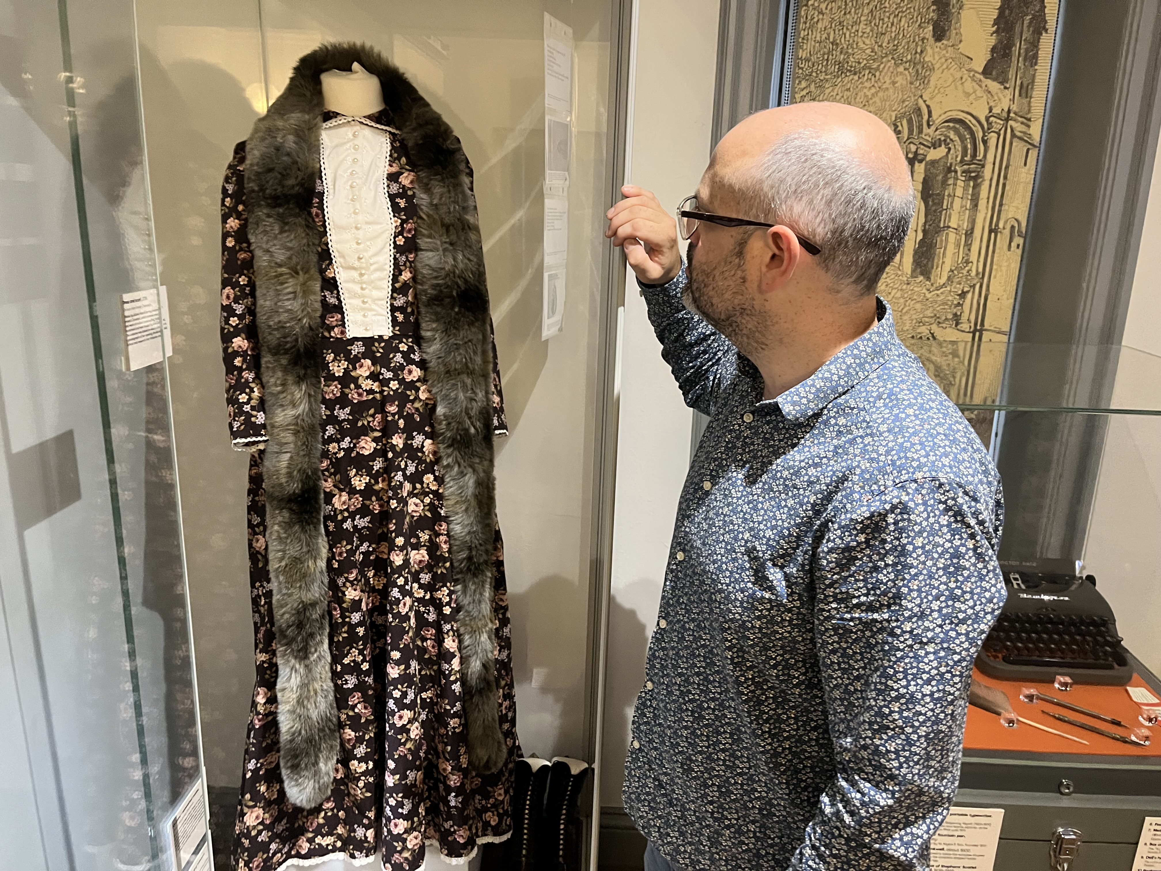 Curator Patrick Bourne with a dress created as part of theatre show and exhibition Corseted, which centred around the life and work of radical Leeds suffragist Alice Cliff Scatcherd.