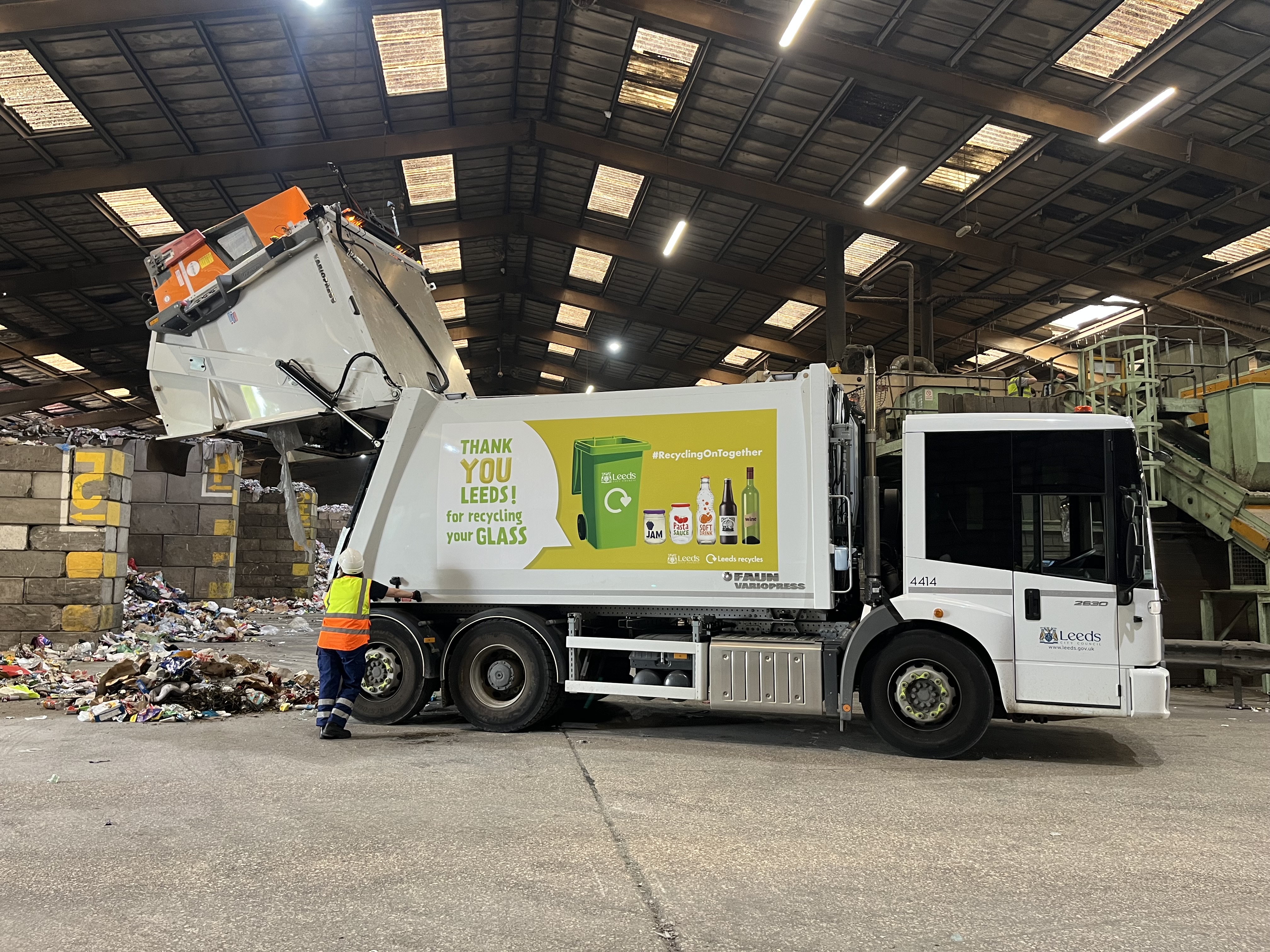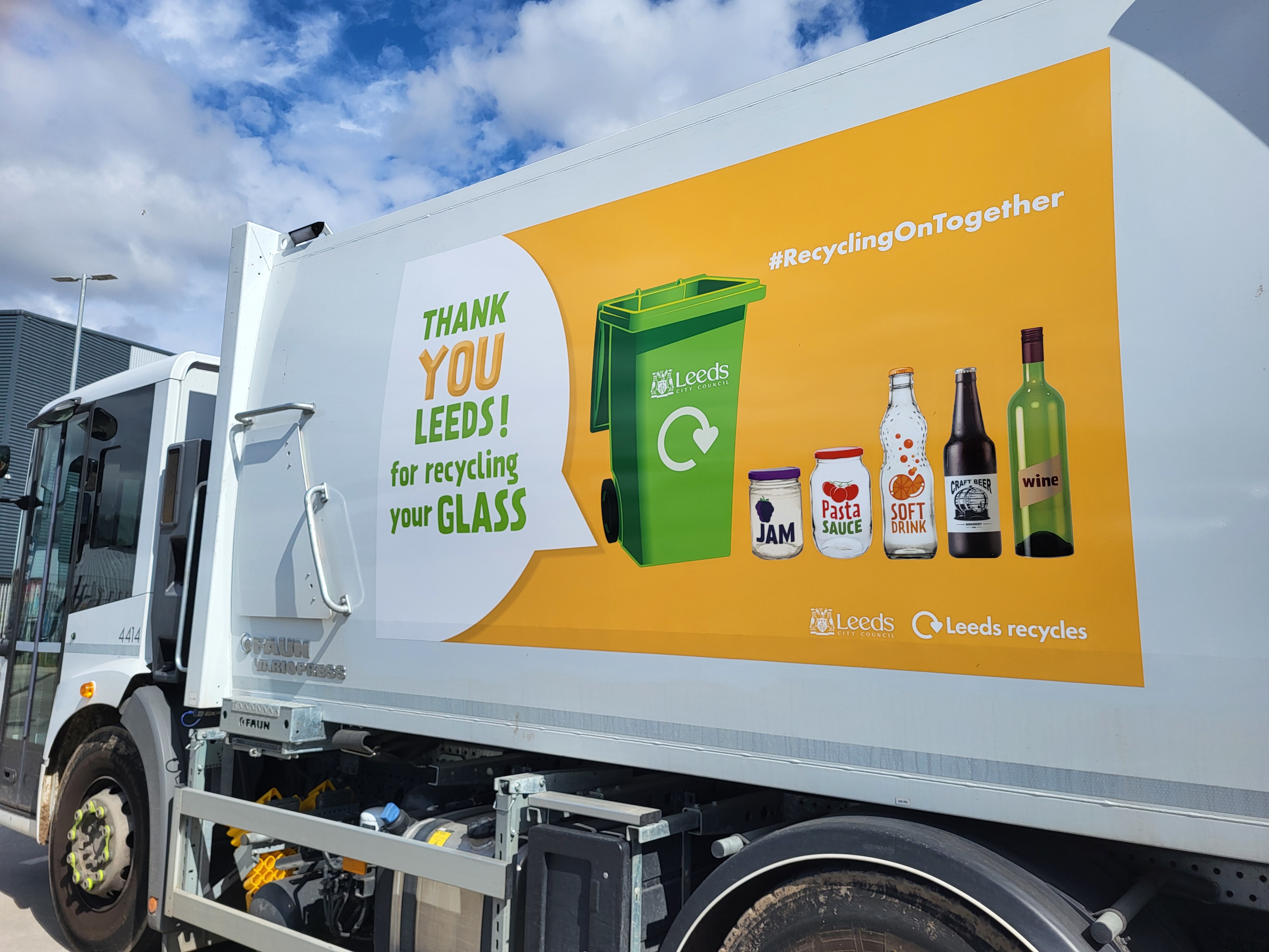 Leeds bin wagon with 'Thank you Leeds for recycling your glass' image on its side