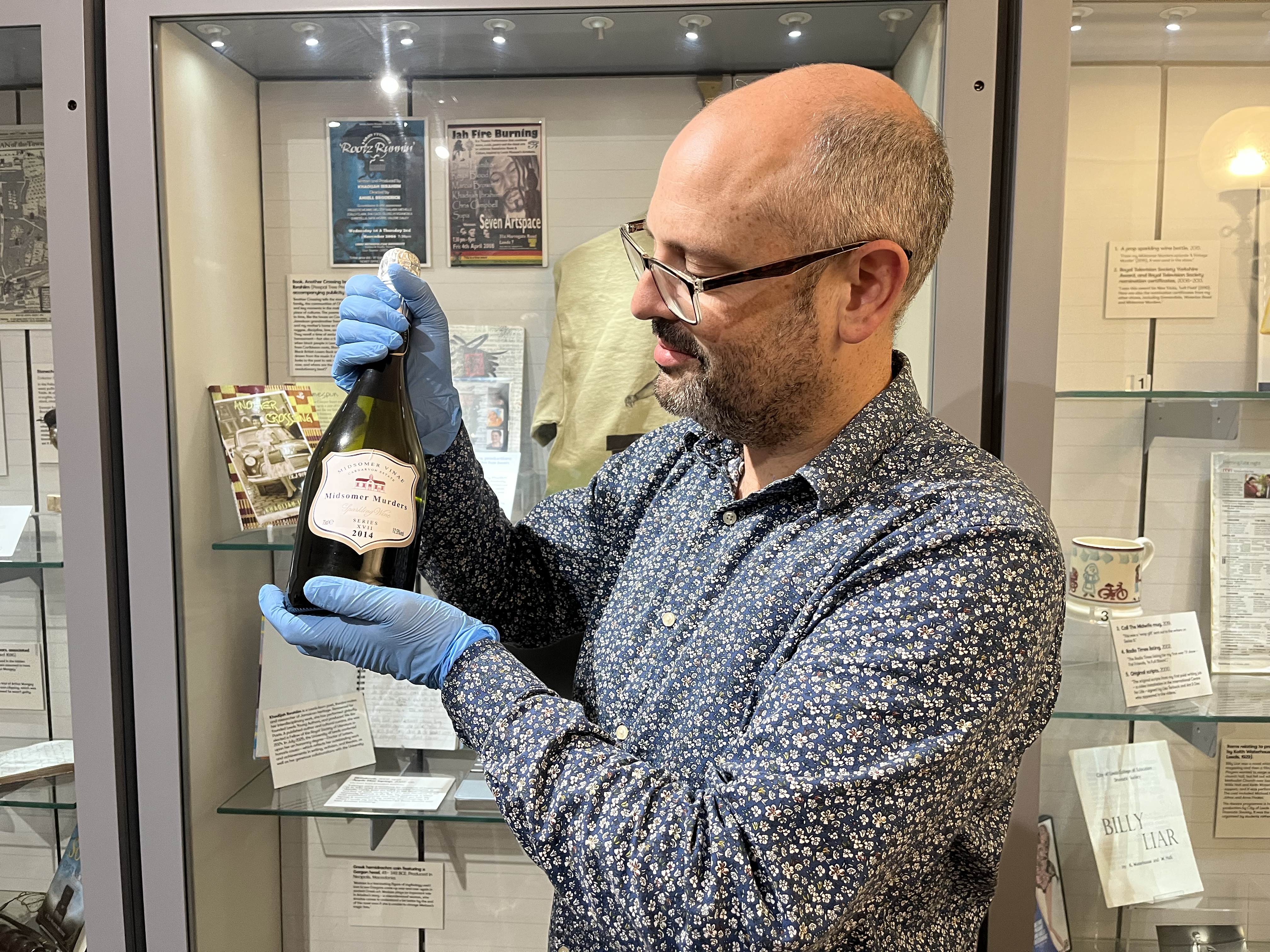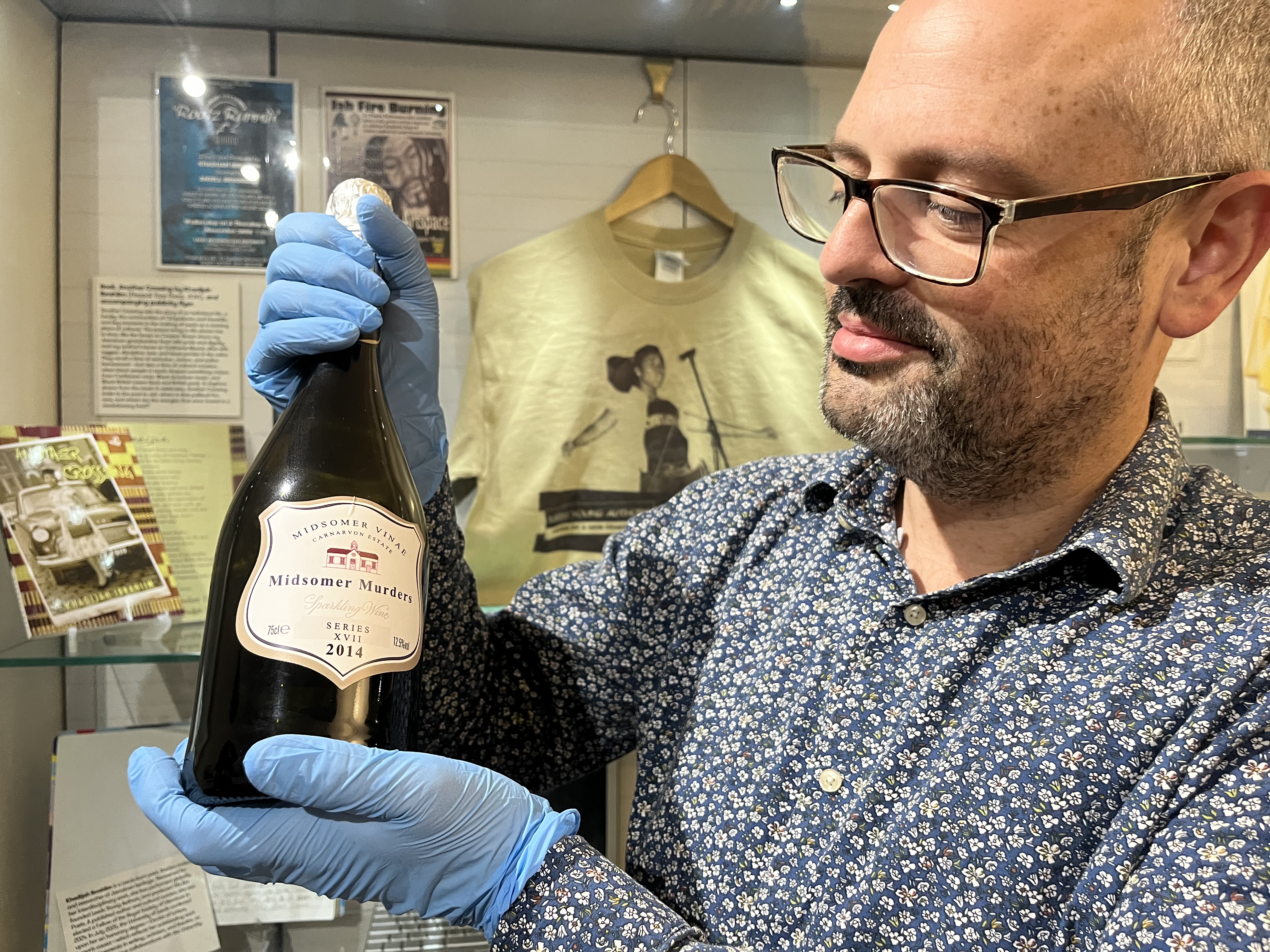 Curator Patrick Bourne with a wine bottle from the set of celebrated bucolic British crime drama Midsomer Murders, on loan from screenwriter and playwright Lisa Holdsworth who has also worked on hit shows including Call the Midwife and Fat Friends.