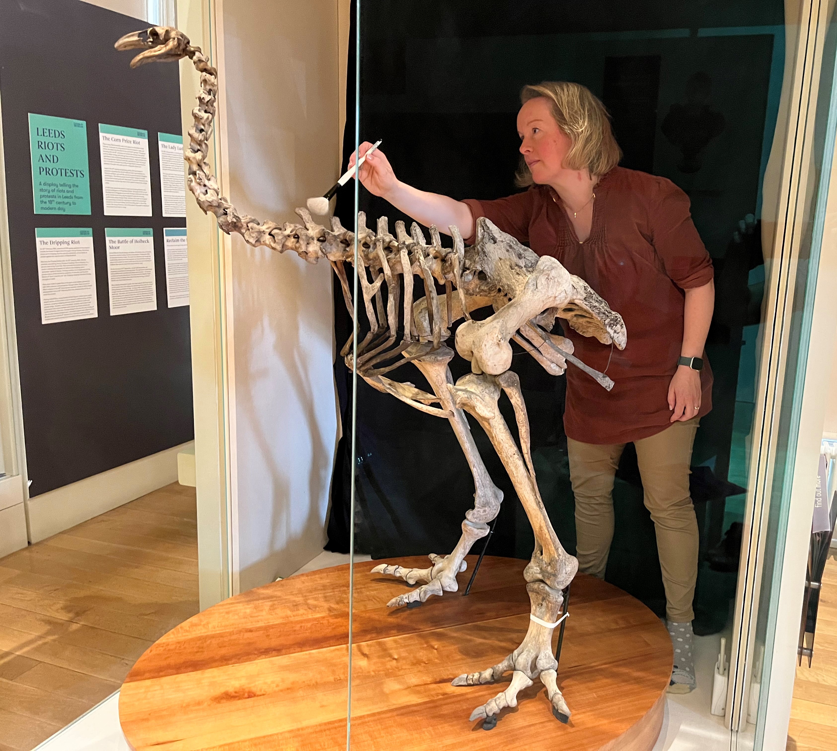 Visitor assistant Joanne Medd cleans the incredibly rare and complete bones of the heavy-footed moa, a huge flightless bird which once roamed parts of New Zealand. The skeleton is on display at Leeds City Museum.