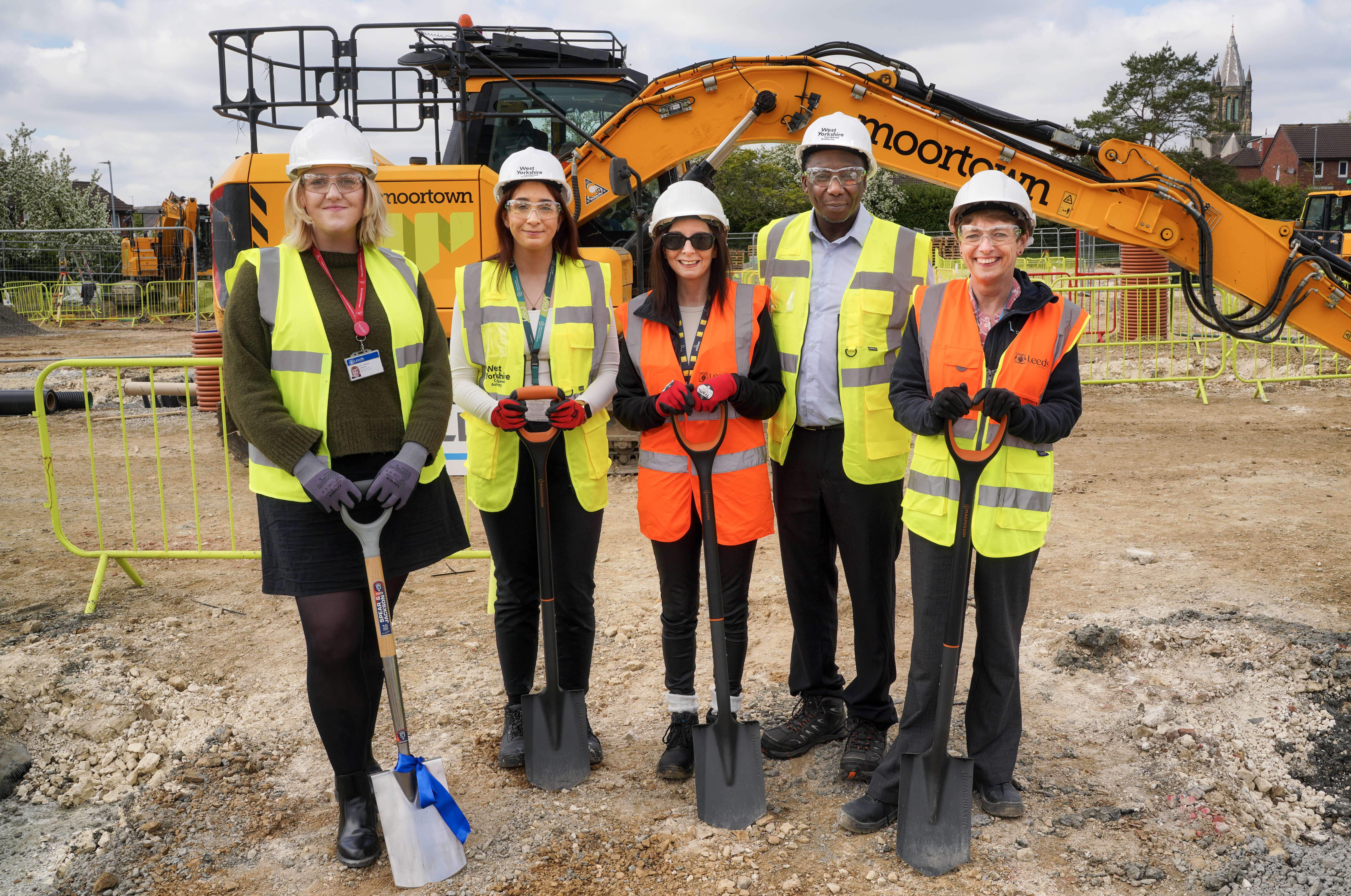 Councillor Jess Lennox (Leeds City Council’s executive member for housing), Zoe Griffiths (project manager for the West Yorkshire Combined Authority), Madeleine Edwards (Leeds City Council's head of housing management) , Nicholas Kiwomya (development manager for the West Yorkshire Combined Authority) and Juliet Duke (service manager for extra care at Leeds City Council) at the Middlecross site.