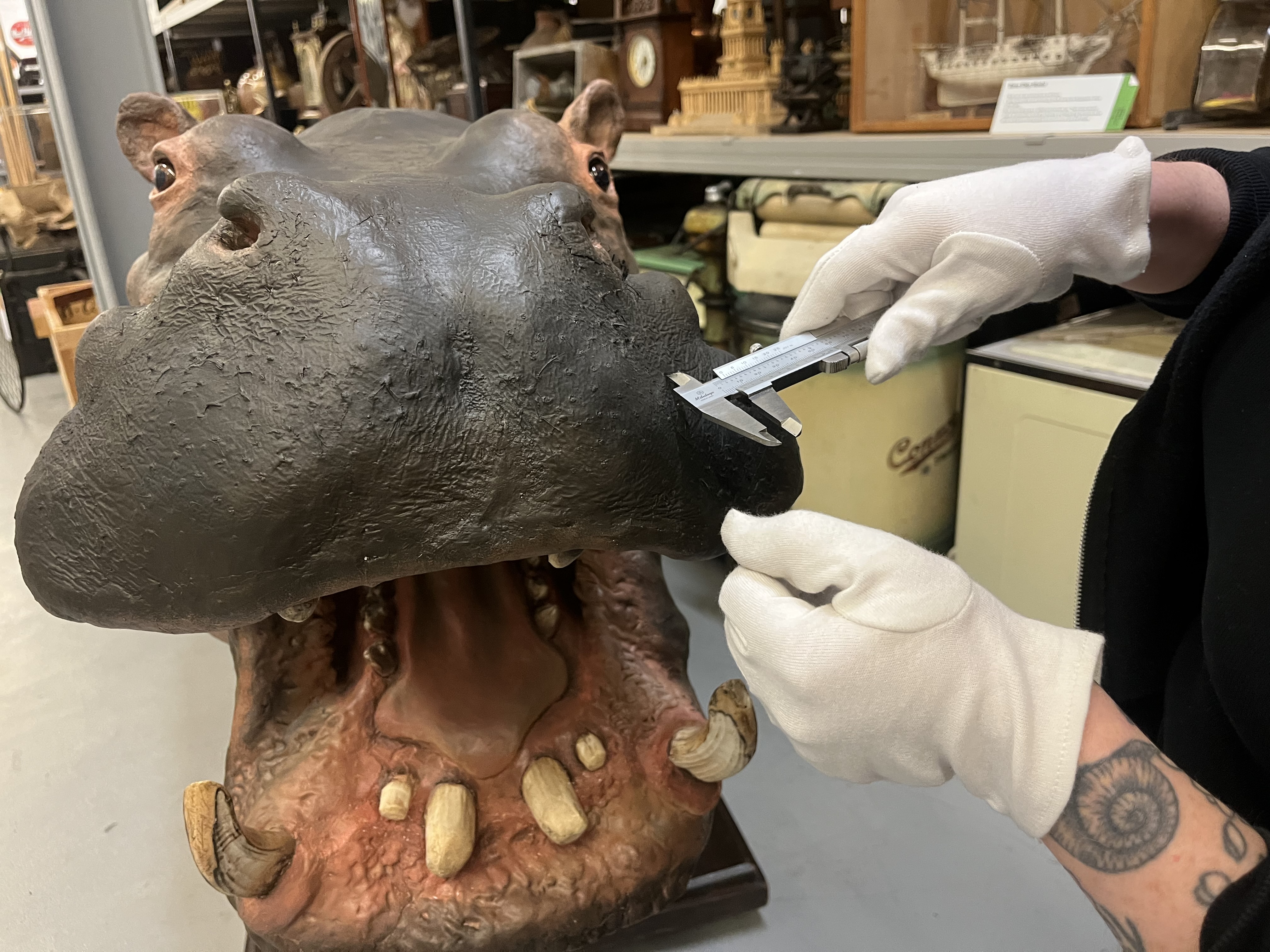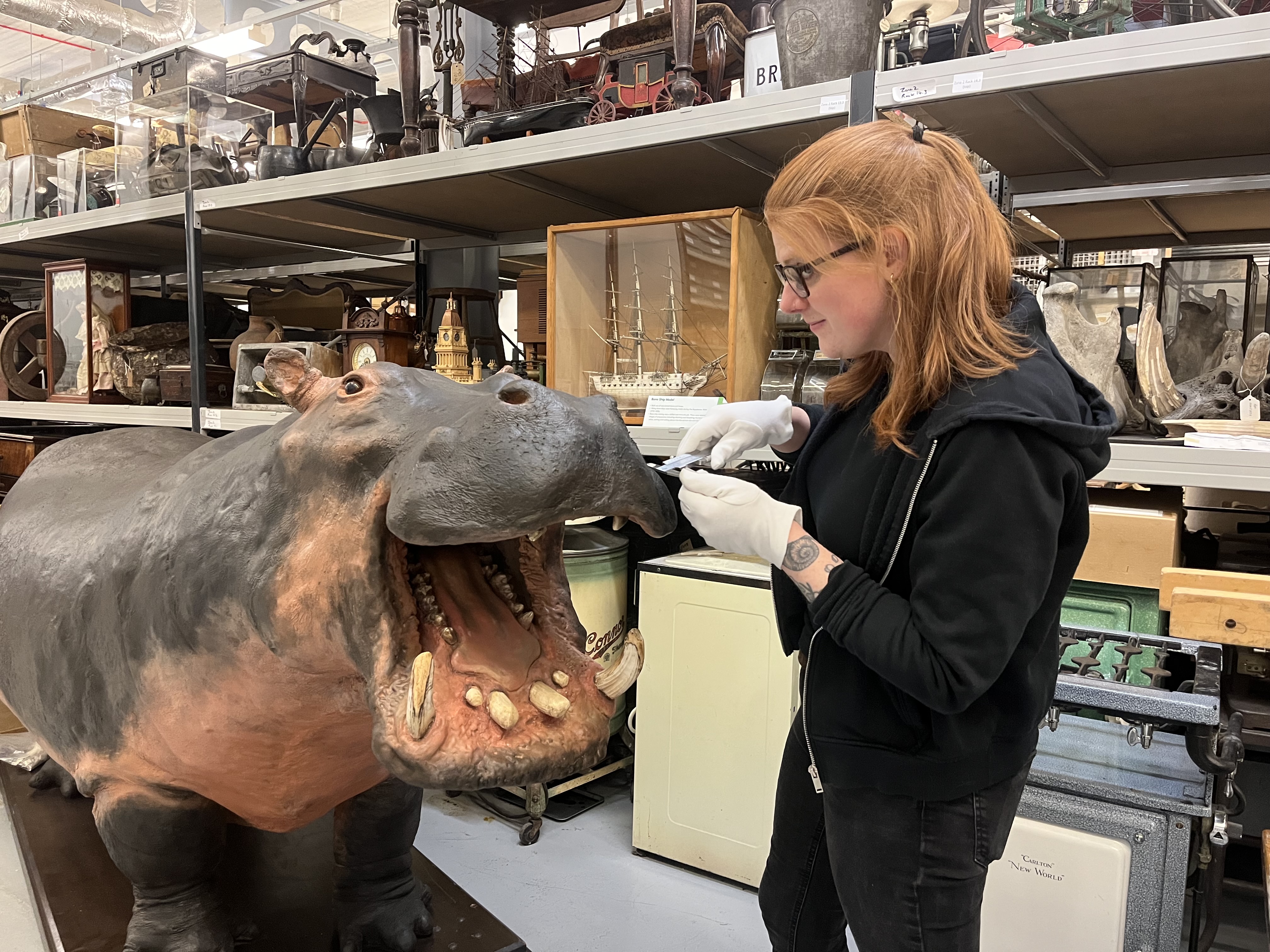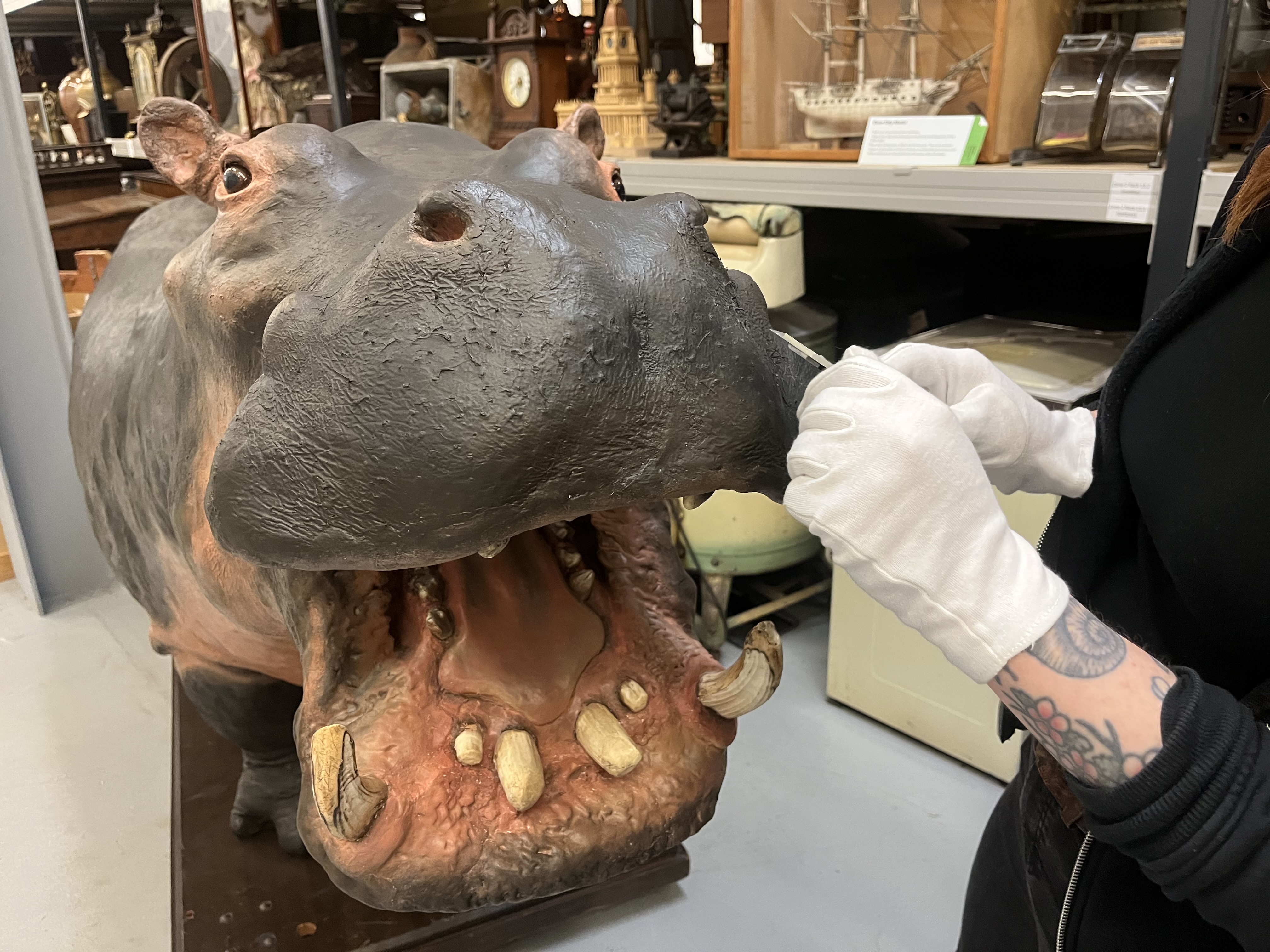 Sarah Burhouse, Leeds Museums and Galleries' curator of natural sciences, looks at the whiskers of Billie the hippo at Leeds Discovery Centre.