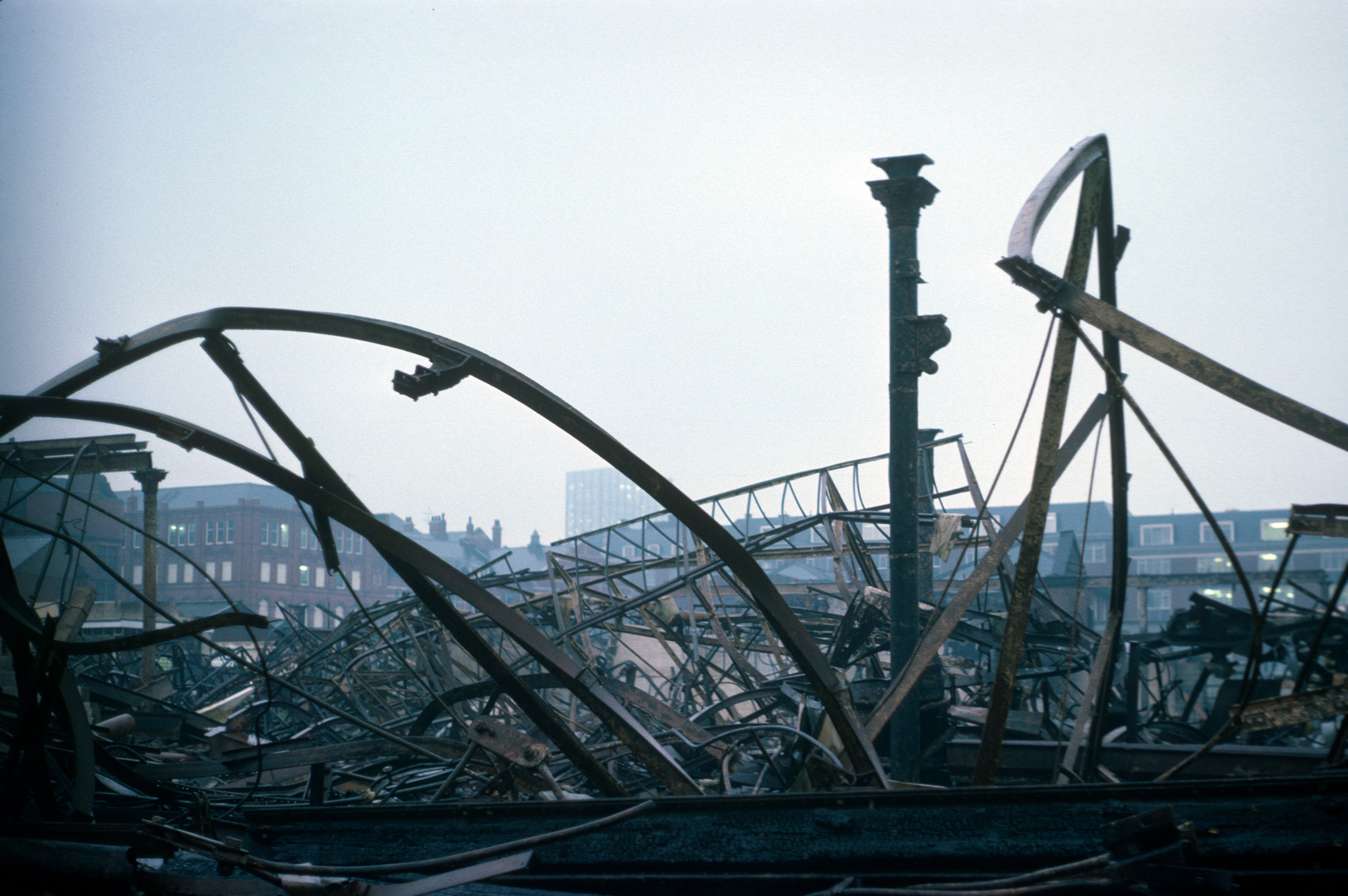 The damaged remains of part of Leeds Kirkgate Market following a fire on December 13 in 1975. Copyright: Leeds Libraries.