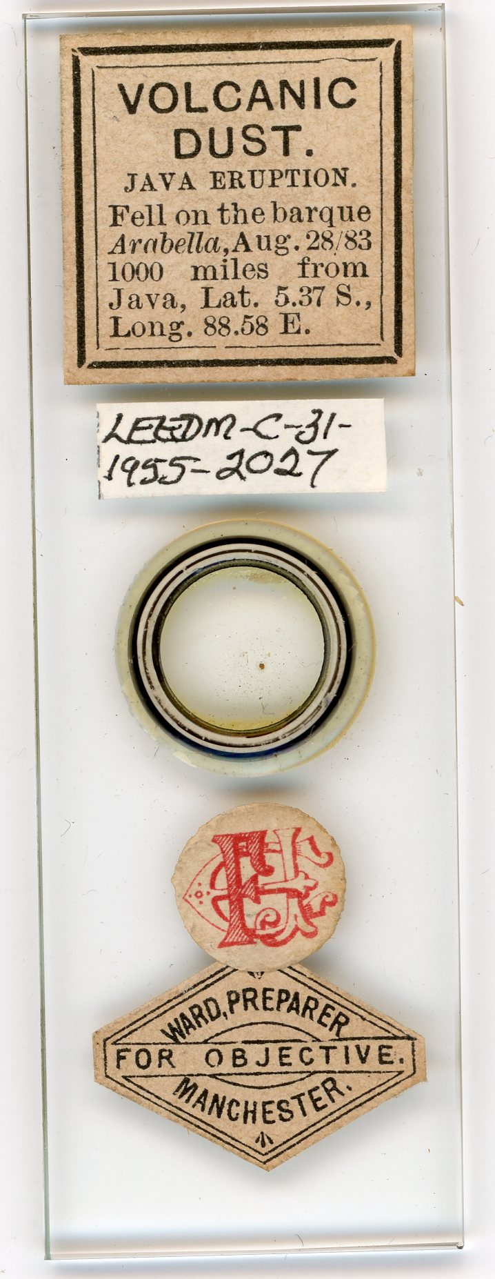 Another slide contains a mote of dust from the infamous Krakatoa volcanic eruption of 1883, one of the most destructive events of its kind in recorded history, which was so loud it was heard more than 1,900 miles away.