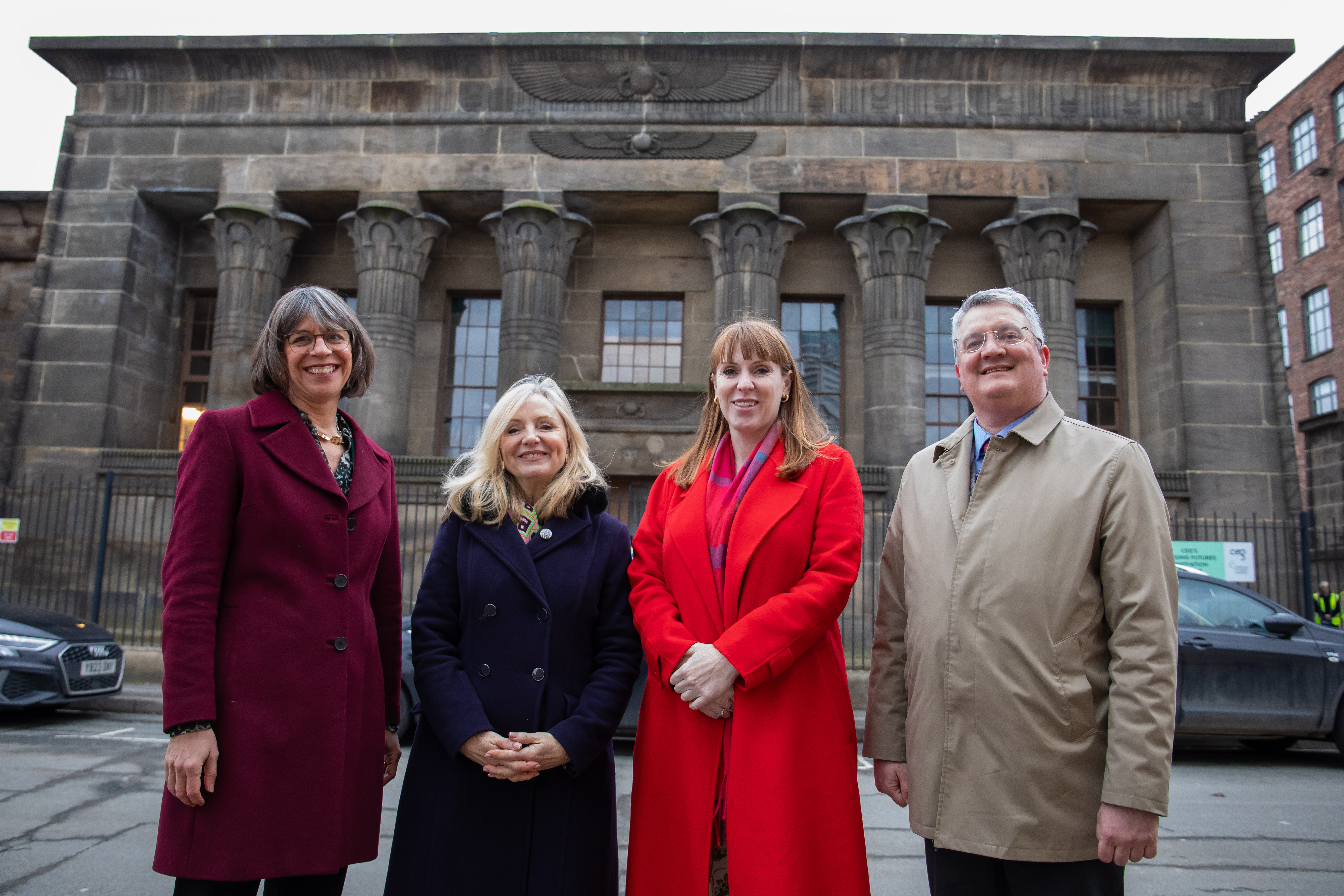 Left to right: British Library chief executive Rebecca Lawrence, Mayor of West Yorkshire Tracy Brabin, Deputy Prime Minister Angela Rayner and Leeds City Council leader Councillor James Lewis visit the Temple Works site on February 13, 2025. Credit: Simon Walker/Deputy Prime Minister's Office.