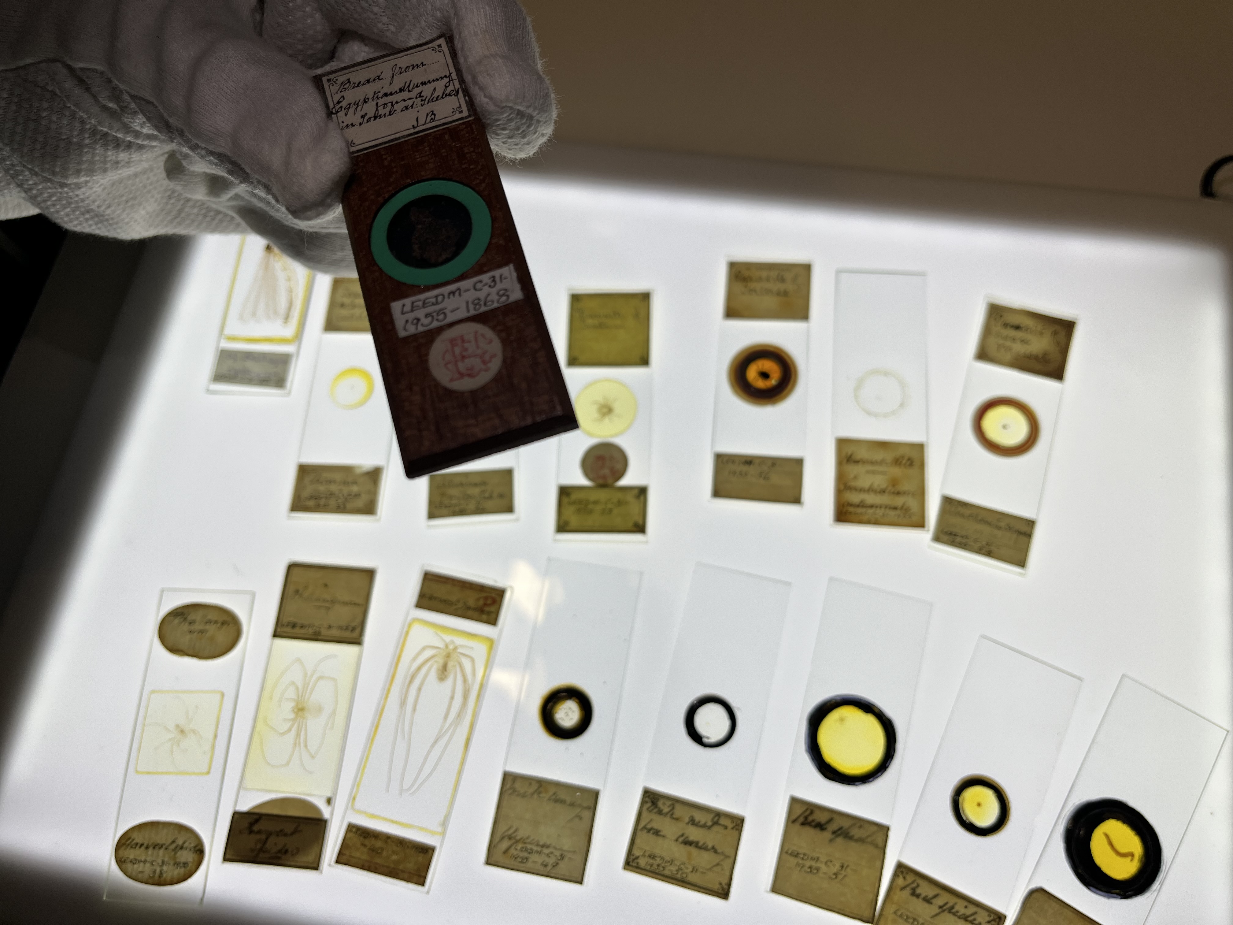 The morsel of ancient Egyptian bread alongside slides containing spiders and insects from around the world, carefully preserved more than a century ago.