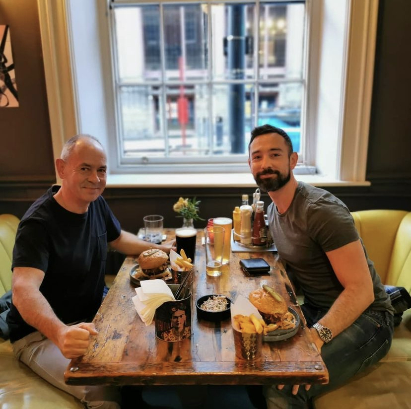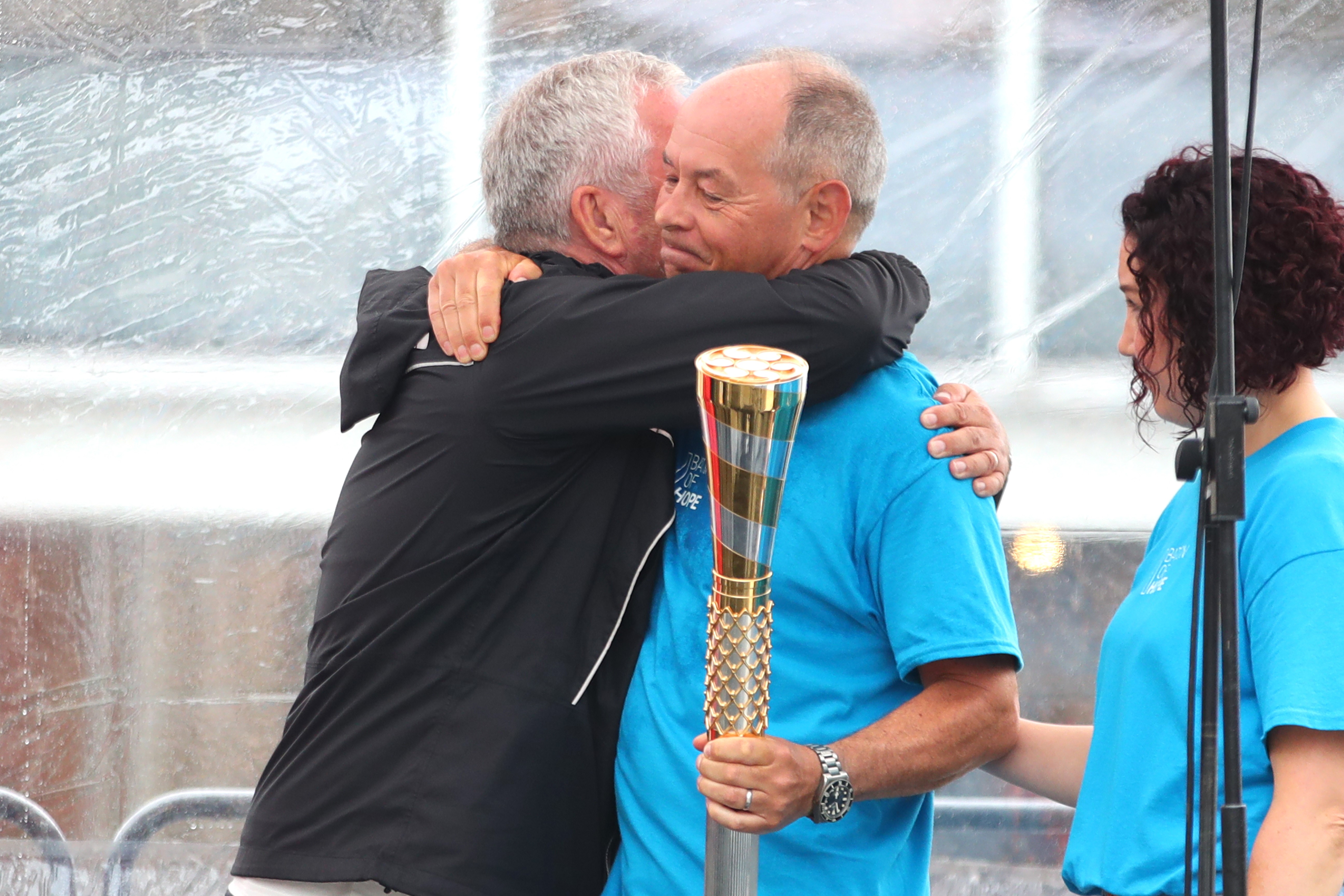 Steve Phillip, who lost his son Jordan, of Leeds, to suicide in 2019, pictured hugging fellow Baton of Hope UK co-founder Mike McCarthy, during the 2023 tour.