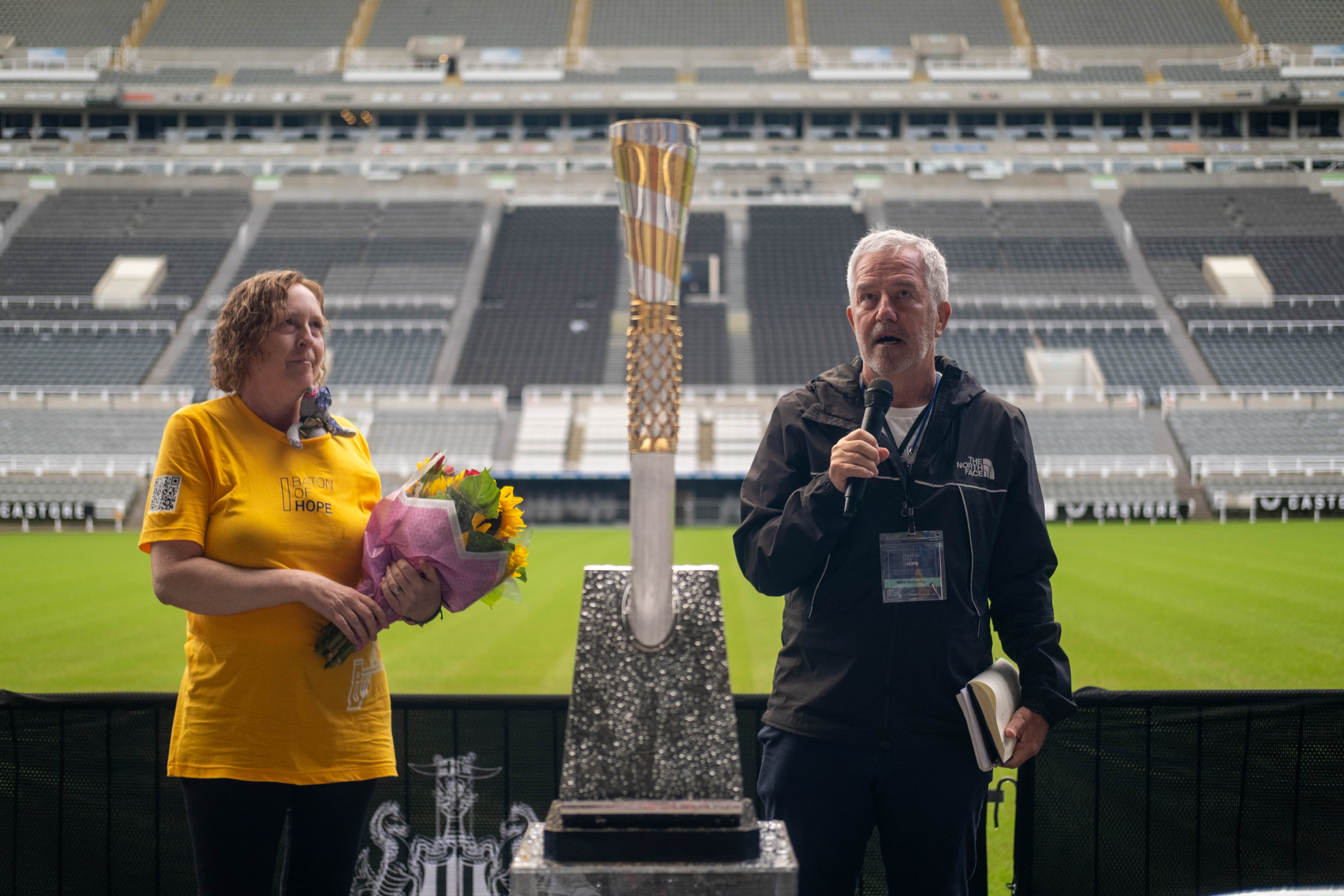 Baton of Hope UK co-founder Mike McCarthy is pictured, with fellow charity member Jayne Walsham, during the Newscastle stop of the 2023 tour.