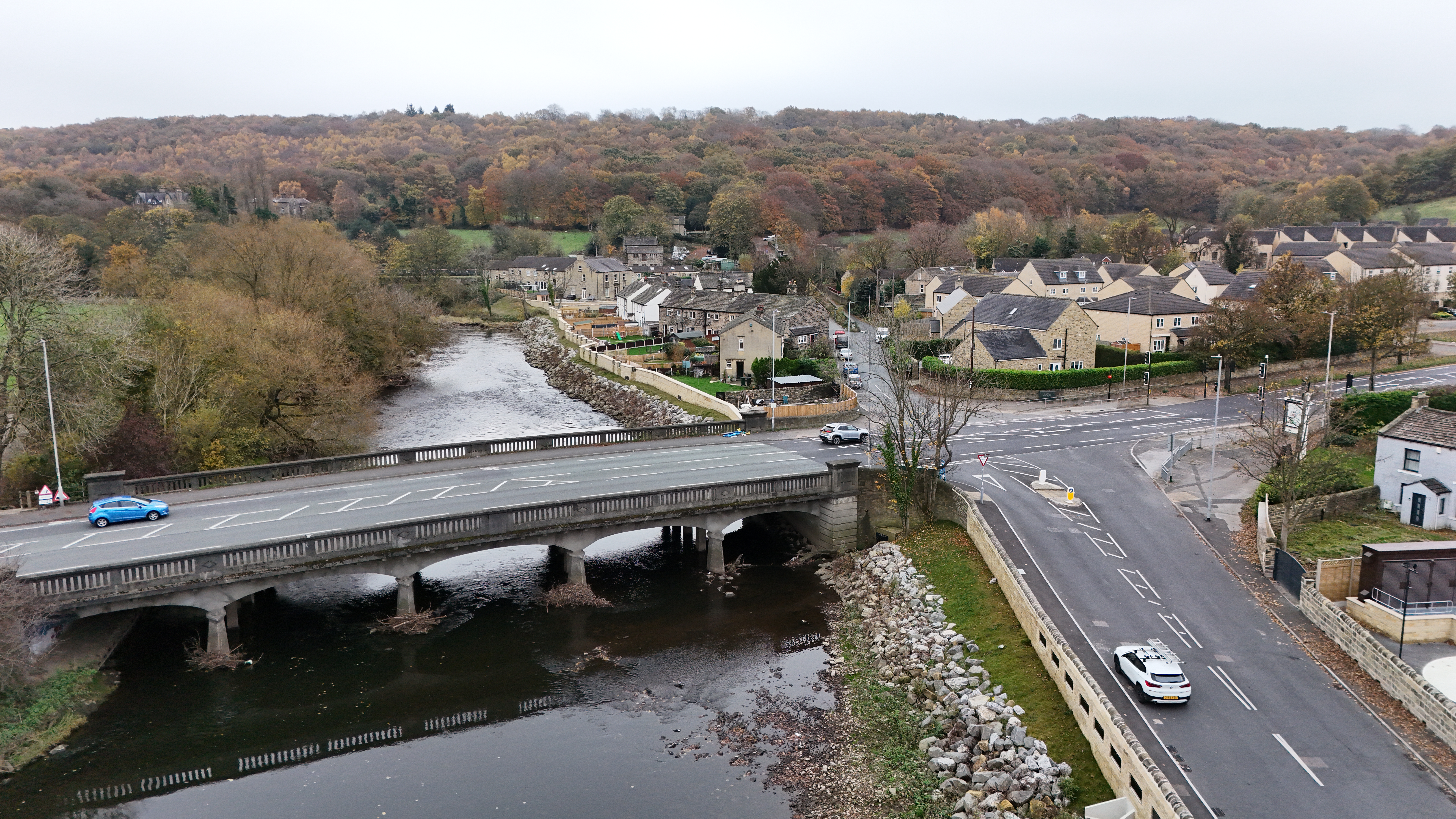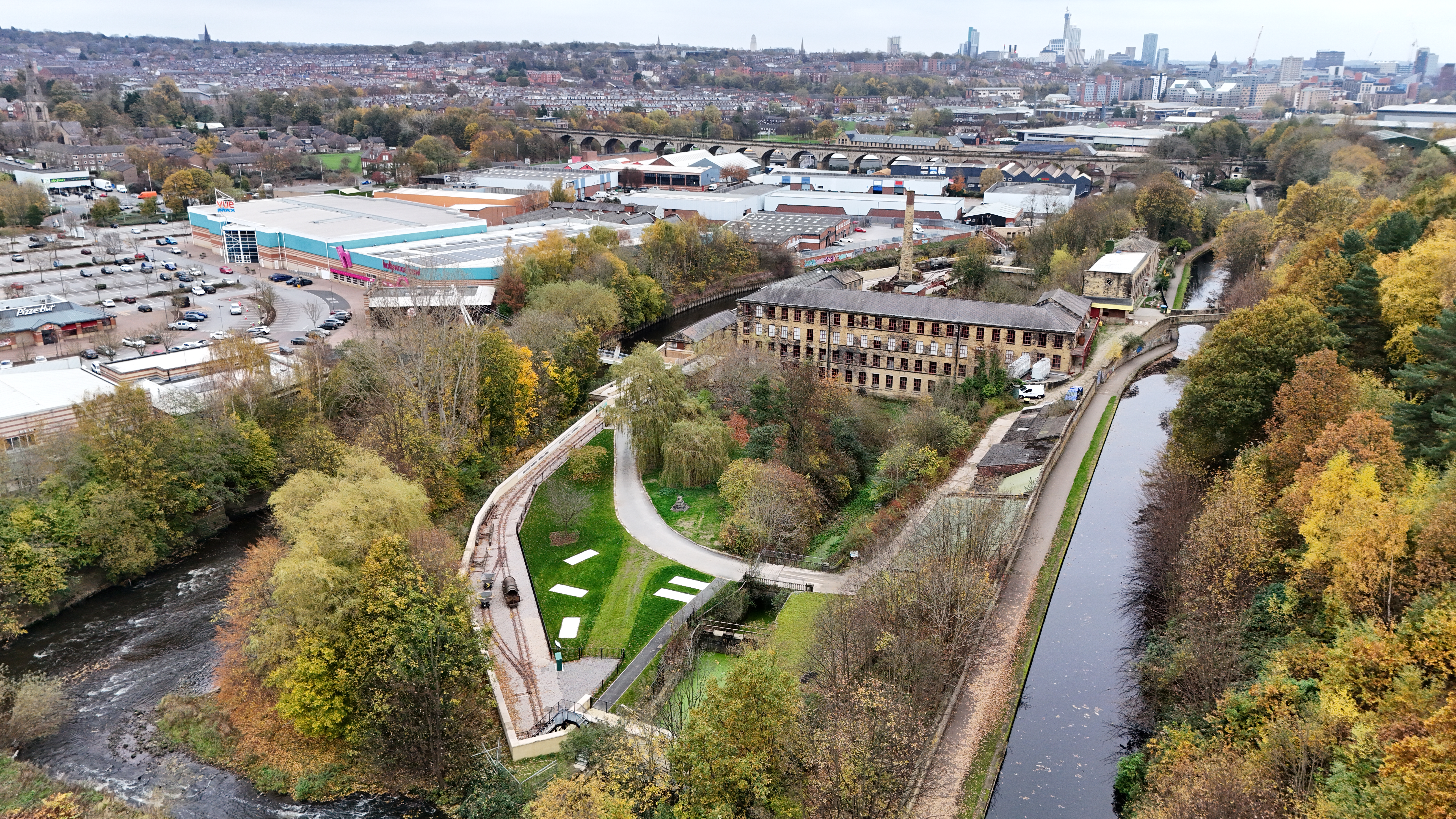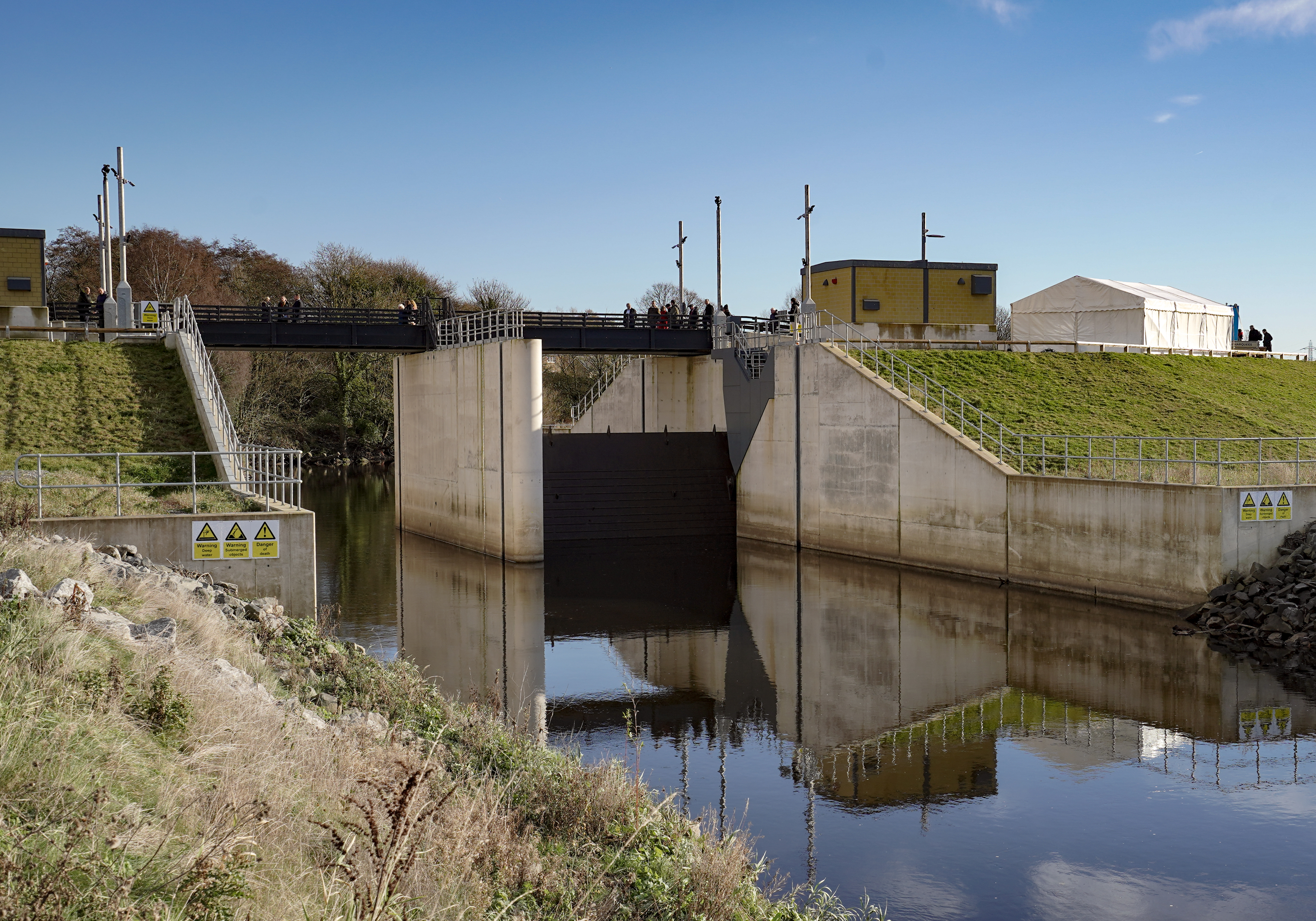 Leader of Leeds City Council Cllr James Lewis cuts the ribbon to mark completion of the Leeds Flood Alleviation Scheme next to Baroness Judith Blake (in centre, former leader of the council) along with Lord Mayor of Leeds Councillor Abigail Marshall Katung (furthest left) and Cllr Jonathan Pryor, deputy leader of Leeds City Council and executive member for economy, transport and sustainable development (furthest right) together with invited partners and stakeholders.