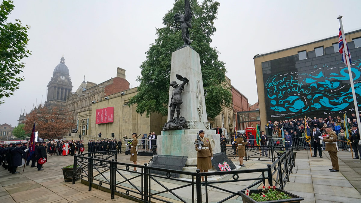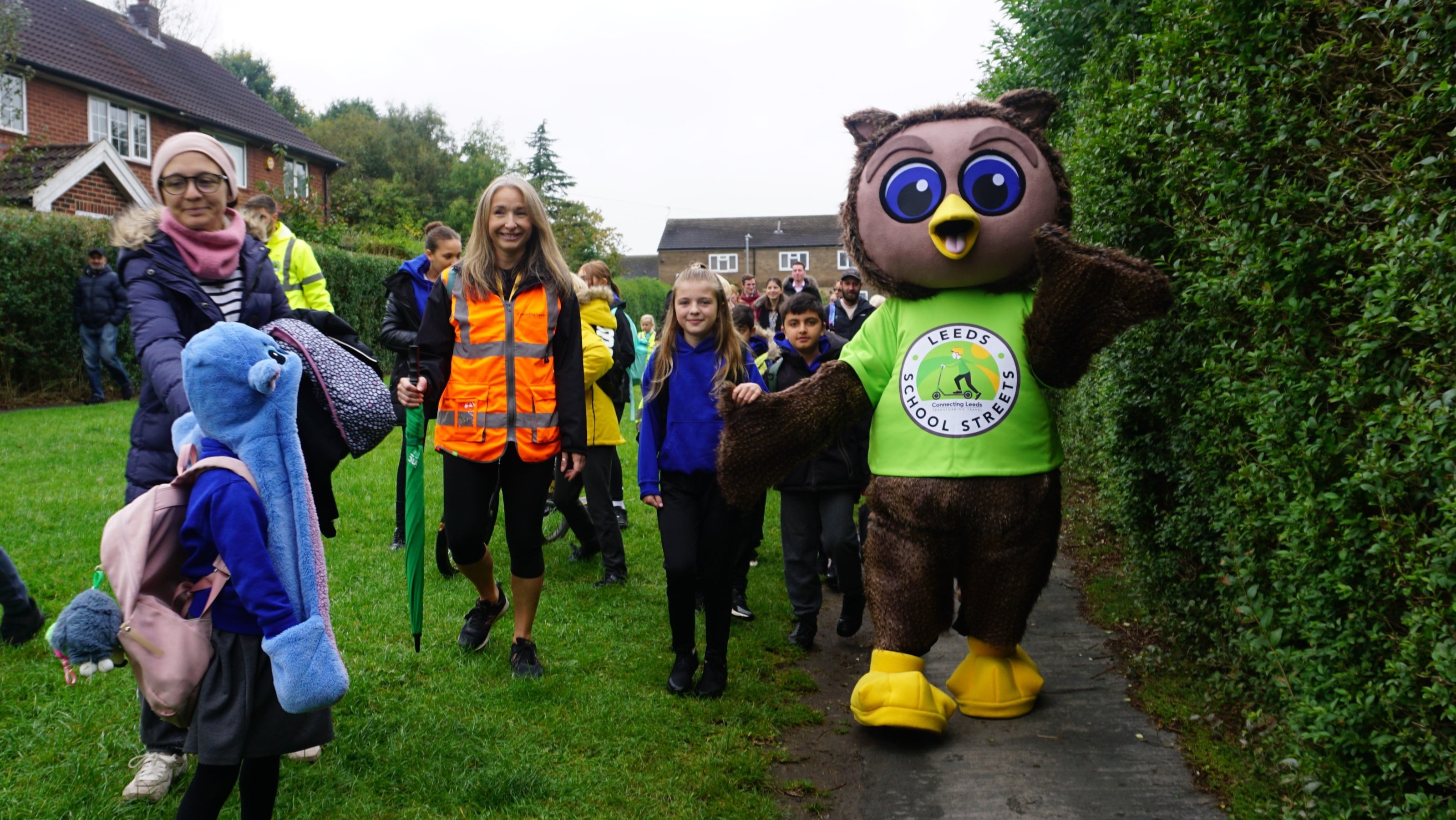 Leeds City Council safe and sustainable travel mascot, Arlo the Owl, guiding pupils from Ireland Wood primary school across the School Street