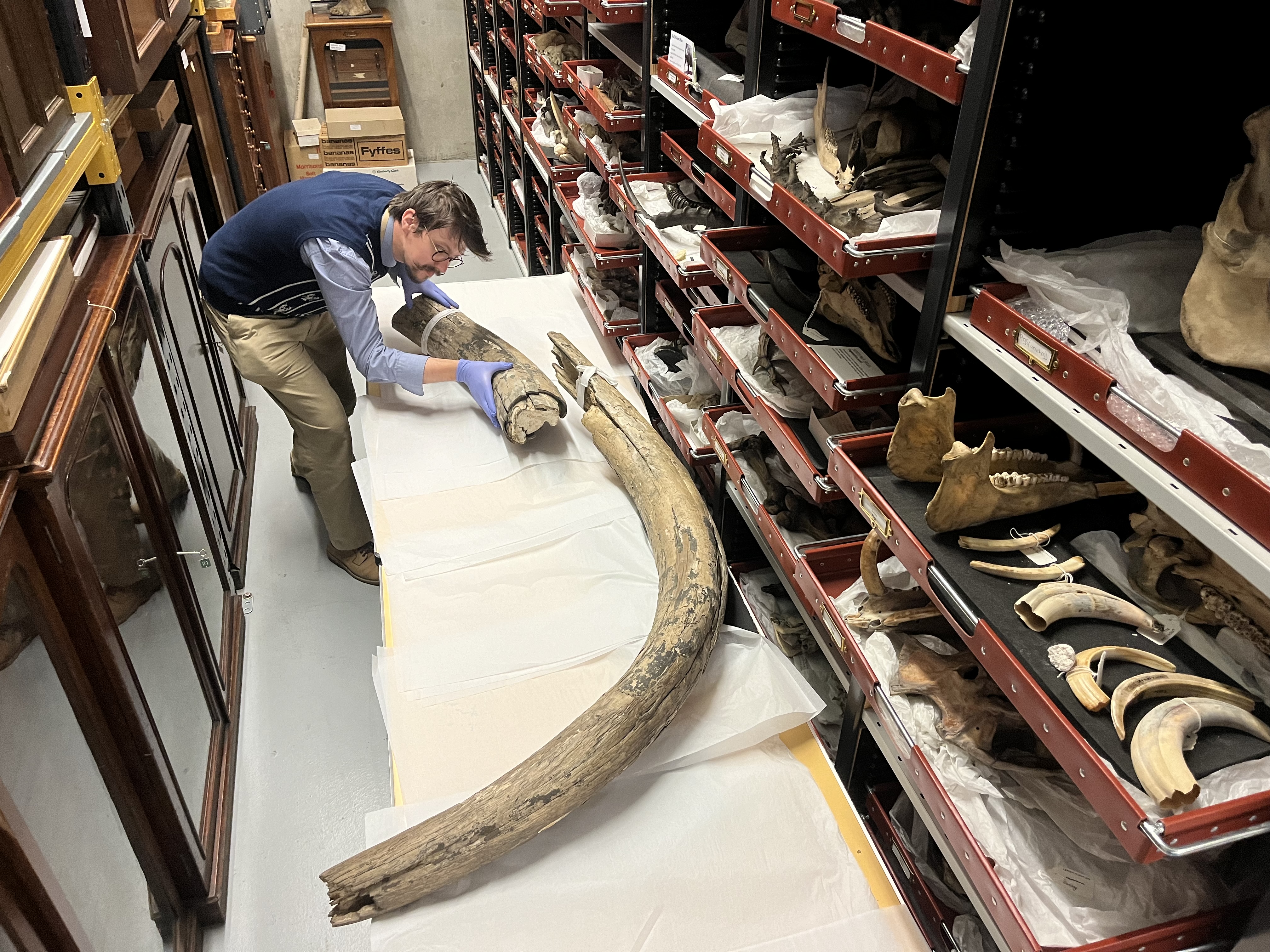 Leeds Museums and Galleries learning and access officer Jed Atkinson examines the huge mammoth tusk at the Leeds Discovery Centre.