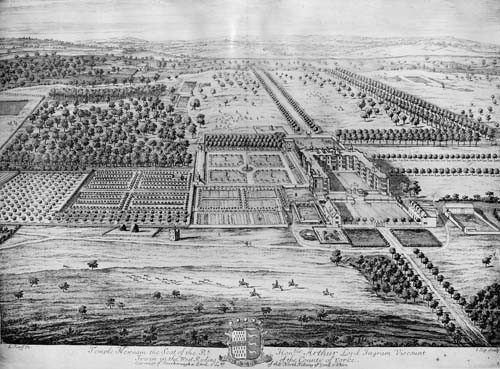 Photograph of an engraving of Temple Newsam by Kip and Knyff was sent to the Parks department by Miss Kitson from the original at Temple Newsam. Johannes (Jan) Kip and Leonard Knyff were Dutch draughtsmen, engravers and painters in the late 17th/early 18th centuries who specialised in engraved views of English country houses. This was one of many featured in their "Britannia Illustrata" published c1708.