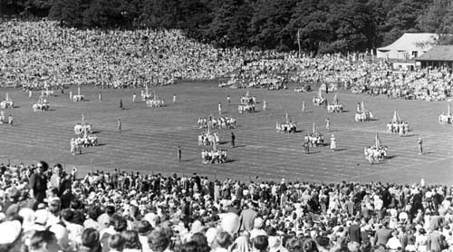 View showing crowds of spectators watching a display of Maypole dancing at the annual Children's Day at Roundhay Park. This was a popular event, attended by schools from all over the city, which ran from 1920 until the 1960s. Children took part in physical exercise displays and dancing and a Queen was crowned each year.